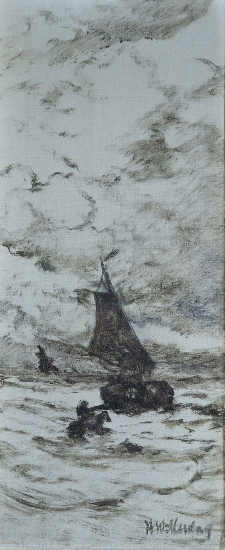 H.W. Mesdag war der Marinemaler der Haagse School. Im relativ hohen Alterwählte entschied er sich für die Malerei. Nach einem Aufenthalt in Oosterbeek und Brüssel liess er sich 1869 im Haag nieder, wo ihn das Strand, das Meer und das Leben der Scheveninger Fischer sofort fesselte. In einer schnellen, lockeren Pinselführung und in zahllosen Variationen von braunen, goldenen und grauen Tönen brachte er diese Motive auf die Leinwand. Mesdag hatte eine grosse Produktion, als wolle er alle verlorene Zeit nachholen. Sein Werk war in Frankreich sehr geliebt und wurde öfters im ‘Salon’ in Paris mit einem Preis augezeichnet.