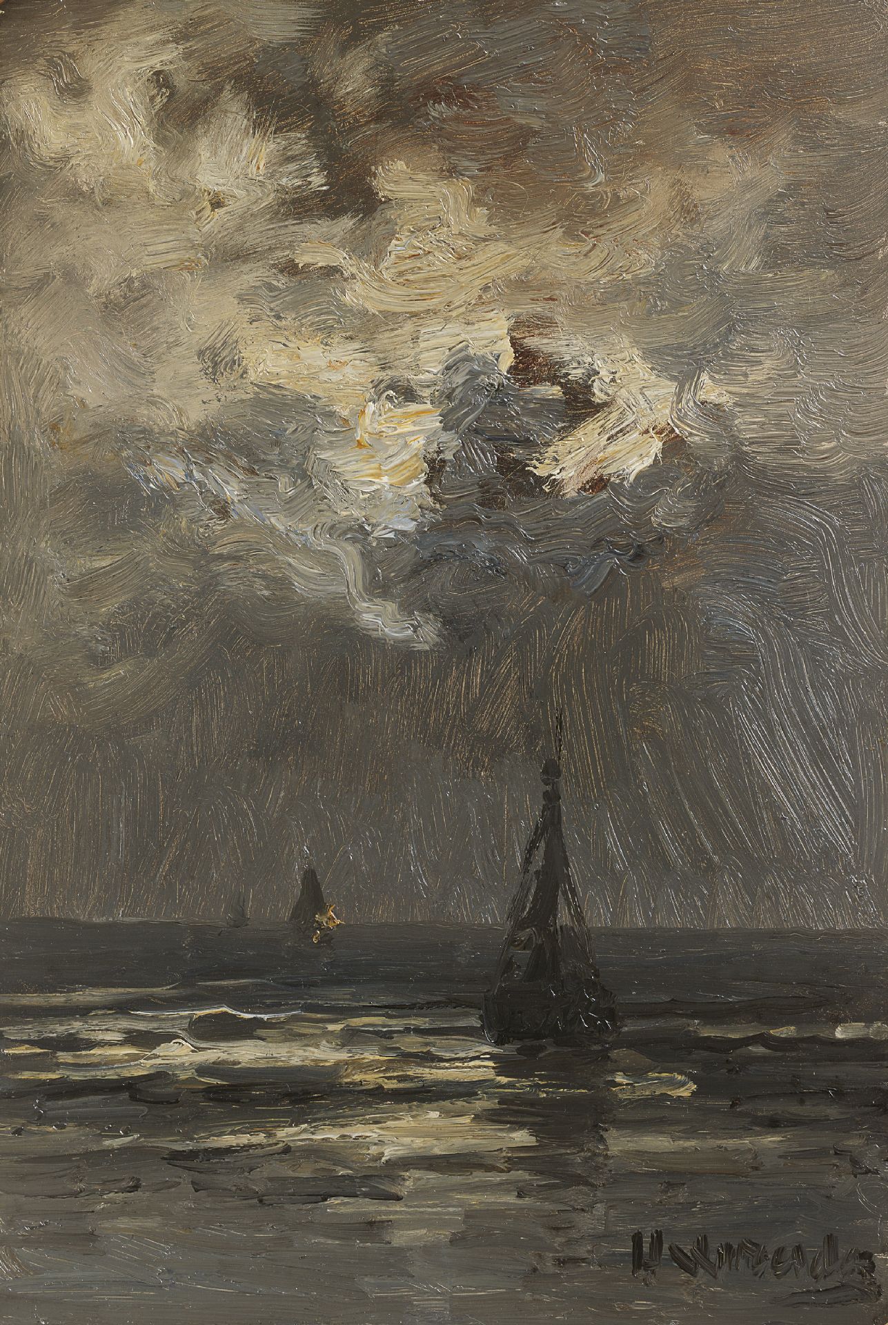 Hendrik Willem Mesdag Kunstwerk • Gemälde • zuvor zu verkaufen Fishing boats in a calm by moonlight