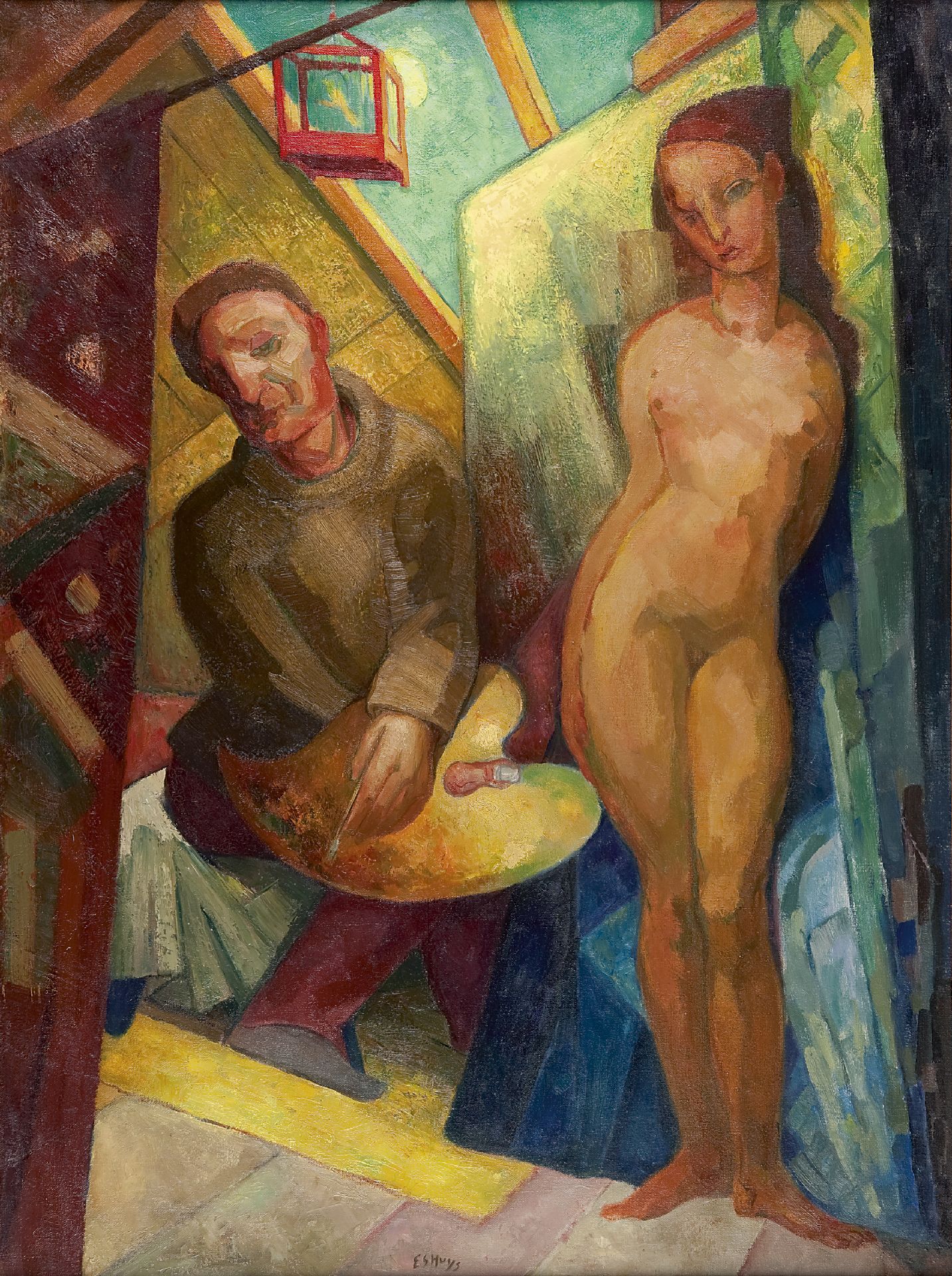 Der Handwerker und Maler Hendrikus Jacobus Eshuijs lebte und arbeitete sein ganzes Leben in Rotterdam. Seltsamerweise ist wenig über den Künstler bekannt. Um 1914 besuchte er die Rotterdamer Akademie der bildenden Künste, wahrscheinlich als Abendstudent. 1912 war er wahrscheinlich mit einem der vielen privaten Designstudios verbunden, die um 1900 existierten. Entwürfe für Wandbehänge und ein Deckenstück stammen aus dieser Zeit. Eshuijs hat auch Poster entworfen. Sein Oeuvre zeigt Einflüsse aus Symbolismus, Art Deco und Kubismus.
