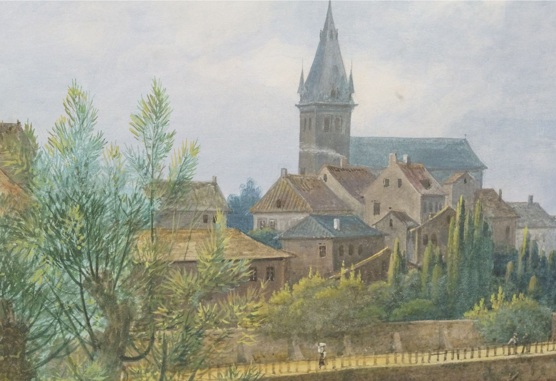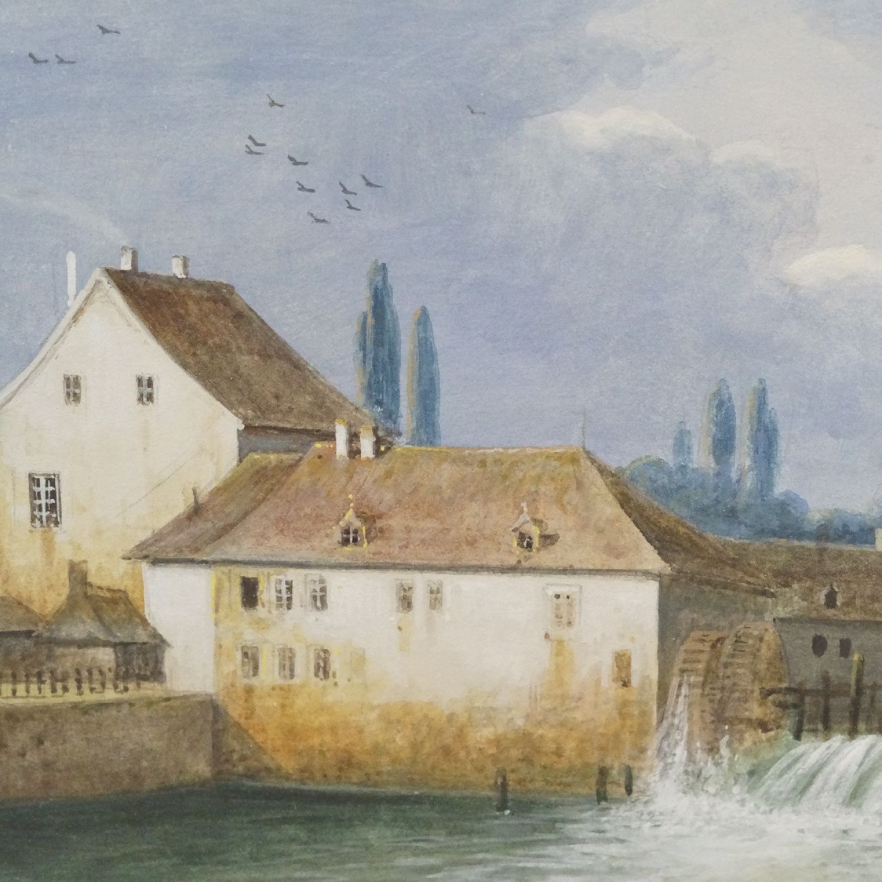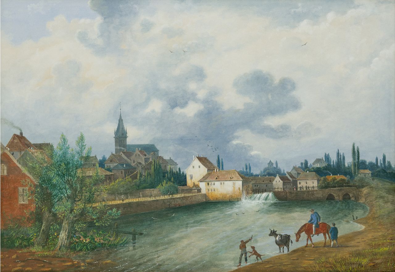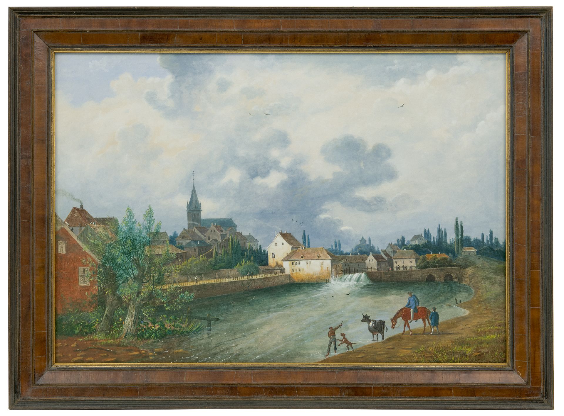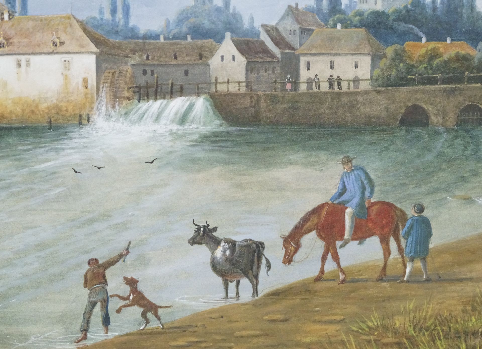Henri Knip Kunstwerk • Aquarell • Zeichnung • zu verkaufen Stadtansicht mit fliessendem Fluss