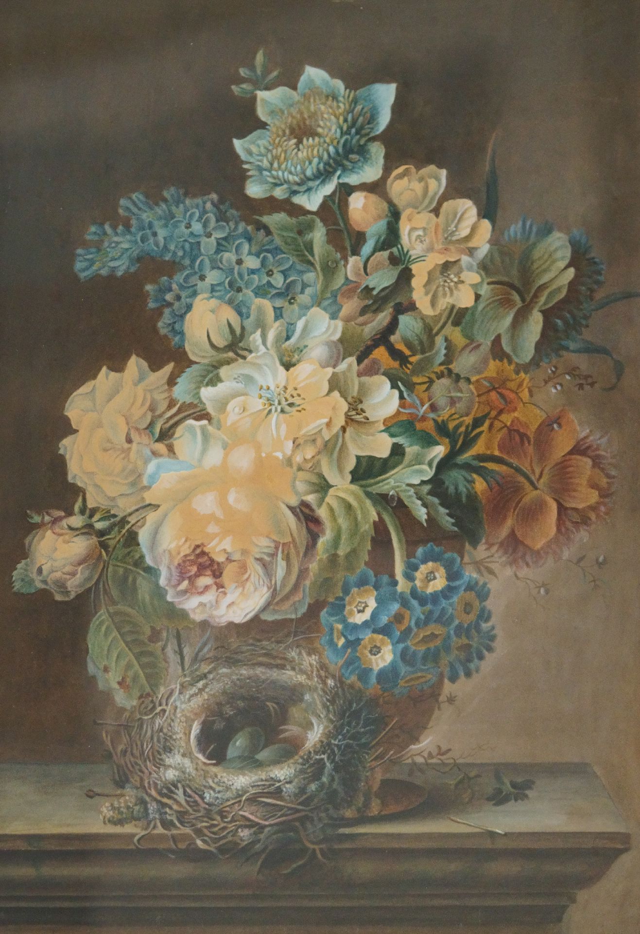 Stilleben mit Blumen und Vogelnest