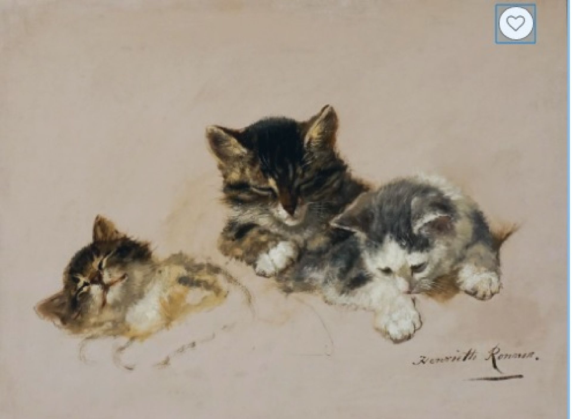 Henriette Ronner-Knip malte anfangs Tierstücke und Hunde, nach 1870 namentlich Katzen. Fehlerlos wusste sie die Textur der Felle, Augen und Farben wiederzugeben und traf sie die manchmal ruhige, dann wieder spielerische und untersuchende Art der Katzen. Ihr Werk war namentlich bei dem aufkommenden Besitzbürgertum des 19. Jahrhunderts sehr beliebt. Sie bildete ihre Tiere denn auch spielend und schlafend ab, indem sie auf und über die kostbaren Möbel und luxuriösen Stoffen krochen. Sowohl in den Niederlanden als in Belgien bekam sie wegen ihr Werk einen Orden.