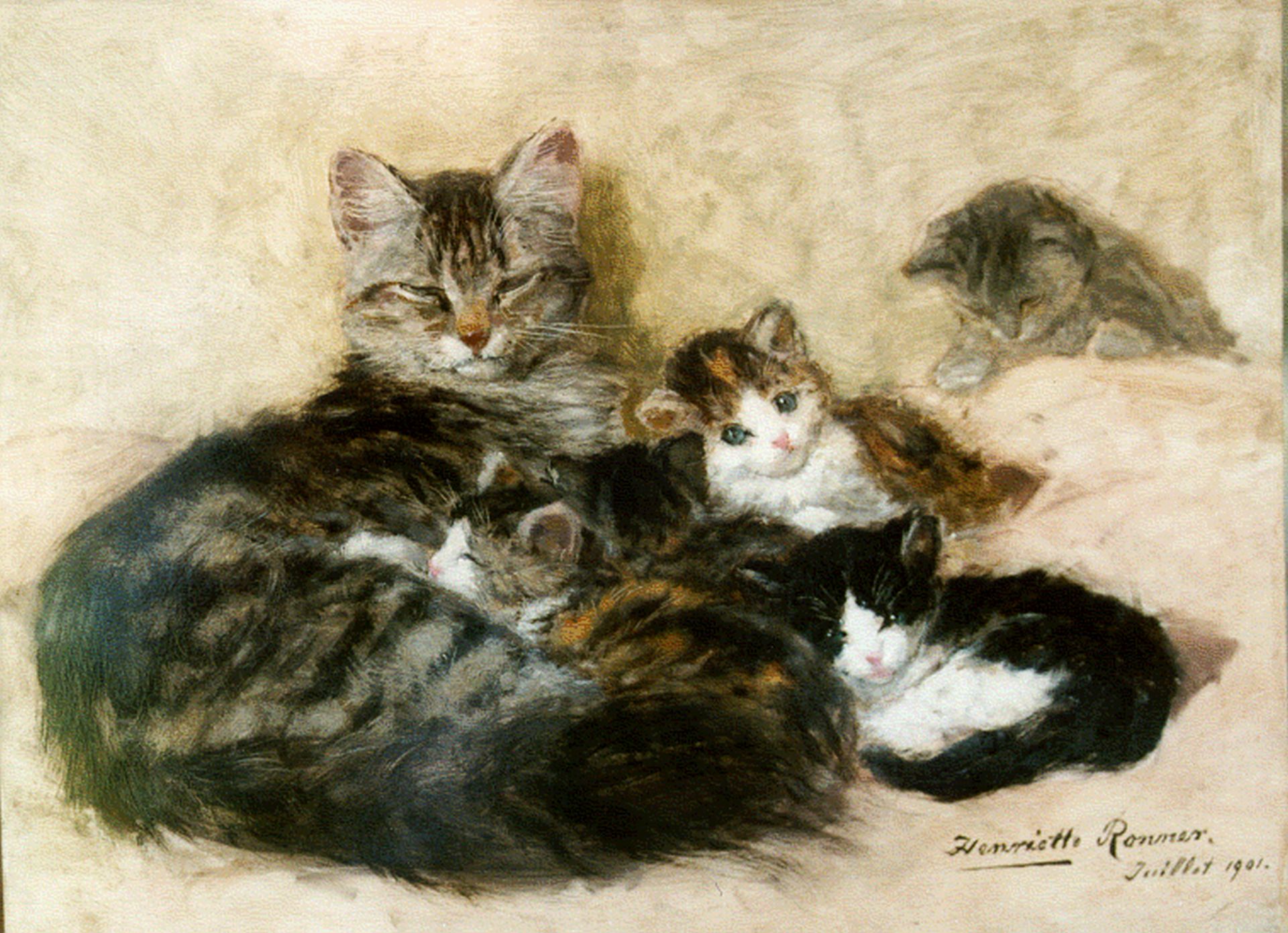 Henriette Ronner-Knip malte anfangs Tierstücke und Hunde, nach 1870 namentlich Katzen. Fehlerlos wusste sie die Textur der Felle, Augen und Farben wiederzugeben und traf sie die manchmal ruhige, dann wieder spielerische und untersuchende Art der Katzen. Ihr Werk war namentlich bei dem aufkommenden Besitzbürgertum des 19. Jahrhunderts sehr beliebt. Sie bildete ihre Tiere denn auch spielend und schlafend ab, indem sie auf und über die kostbaren Möbel und luxuriösen Stoffen krochen. Sowohl in den Niederlanden als in Belgien bekam sie wegen ihr Werk einen Orden.