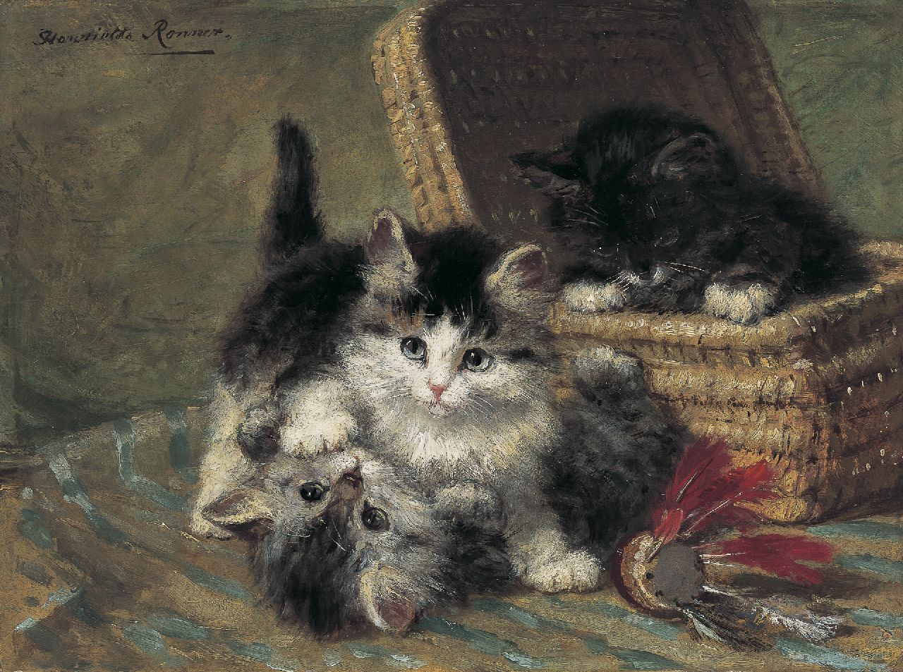 Henriette Ronner-Knip malte anfangs Tierstücke und Hunde, nach 1870 namentlich Katzen. Fehlerlos wusste sie die Textur der Felle, Augen und Farben wiederzugeben und traf sie die manchmal ruhige, dann wieder spielerische und untersuchende Art der Katzen. Ihr Werk war namentlich bei dem aufkommenden Besitzbürgertum des 19. Jahrhunderts sehr beliebt. Sie bildete ihre Tiere denn auch spielend und schlafend ab, indem sie auf und über die kostbaren Möbel und luxuriösen Stoffen krochen. Sowohl in den Niederlanden als in Belgien bekam sie wegen ihr Werk einen Orden.