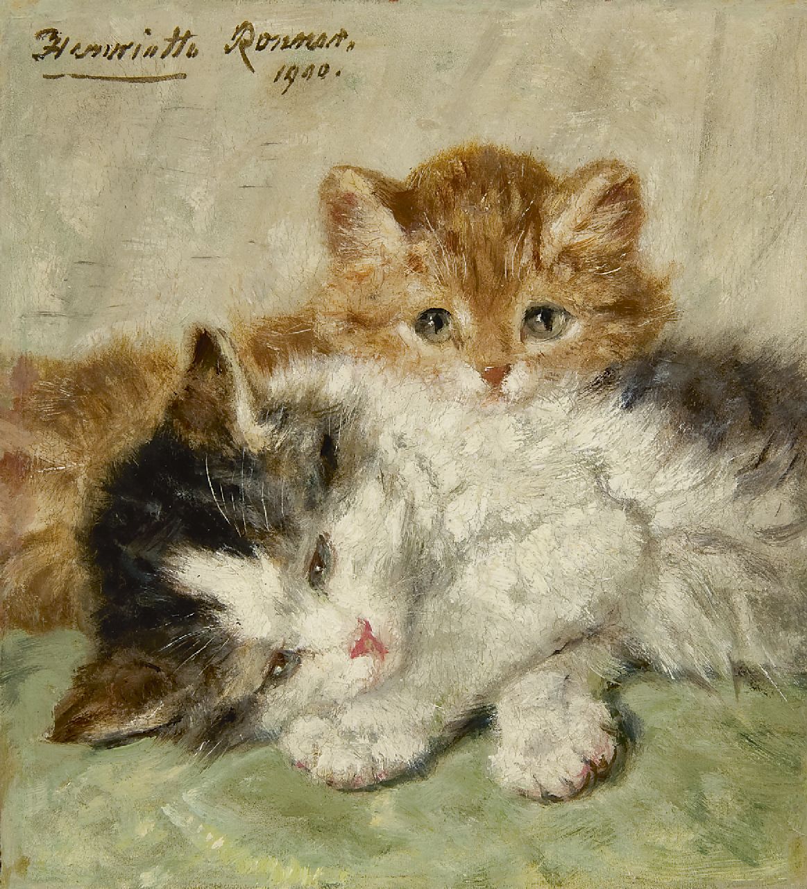 Henriette Ronner-Knip malte anfangs Tierstücke und Hunde, nach 1870 namentlich Katzen. Fehlerlos wusste sie die Textur der Felle, Augen und Farben wiederzugeben und traf sie die manchmal ruhige, dann wieder spielerische und untersuchende Art der Katzen. Ihr Werk war namentlich bei dem aufkommenden Besitzbürgertum des 19. Jahrhunderts sehr beliebt. Sie bildete ihre Tiere denn auch spielend und schlafend ab, indem sie auf und über die kostbaren Möbel und luxuriösen Stoffen krochen. Sowohl in den Niederlanden als in Belgien bekam sie wegen ihr Werk einen Orden.