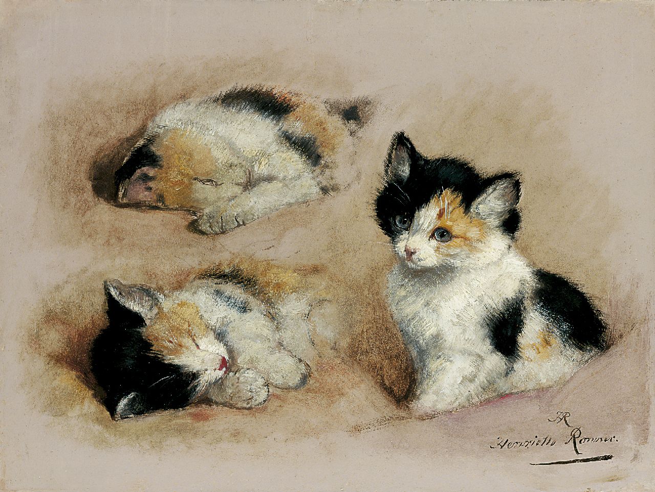 Henriette Ronner-Knip malte anfangs Tierstücke und Hunde, nach 1870 namentlich Katzen. Fehlerlos wusste sie die Textur der Felle, Augen und Farben wiederzugeben und traf sie die manchmal ruhige, dann wieder spielerische und untersuchende Art der Katzen. Ihr Werk war namentlich bei dem aufkommenden Besitzbürgertum des 19. Jahrhunderts sehr beliebt. Sie bildete ihre Tiere denn auch spielend und schlafend ab, indem sie auf und über die kostbaren Möbel und luxuriösen Stoffen krochen. Sowohl in den Niederlanden als in Belgien bekam sie wegen ihr Werk einen Orden.