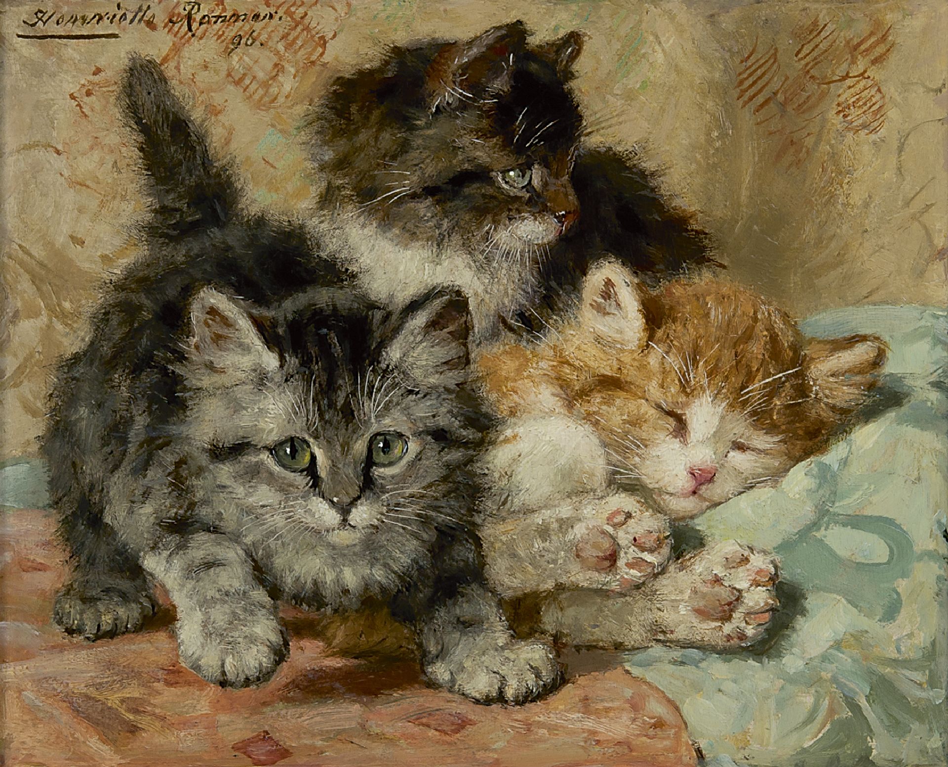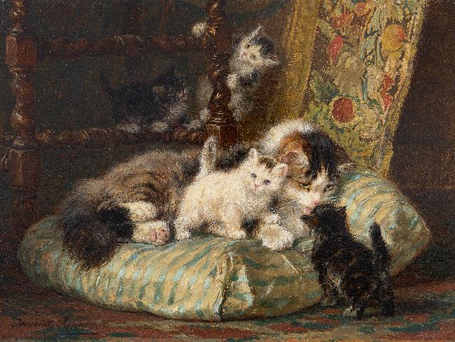 Henriette Ronner-Knip malte anfangs Tierstücke und Hunde, nach 1870 namentlich Katzen. Fehlerlos wusste sie die Textur der Felle, Augen und Farben wiederzugeben und traf sie die manchmal ruhige, dann wieder spielerische und untersuchende Art der Katzen. Ihr Werk war namentlich bei dem aufkommenden Besitzbürgertum des 19. Jahrhunderts sehr beliebt. Sie bildete ihre Tiere denn auch spielend und schlafend ab, indem sie auf und über die kostbaren Möbel und luxuriösen Stoffen krochen. Sowohl in den Niederlanden als in Belgien bekam sie wegen ihr Werk einen Orden.