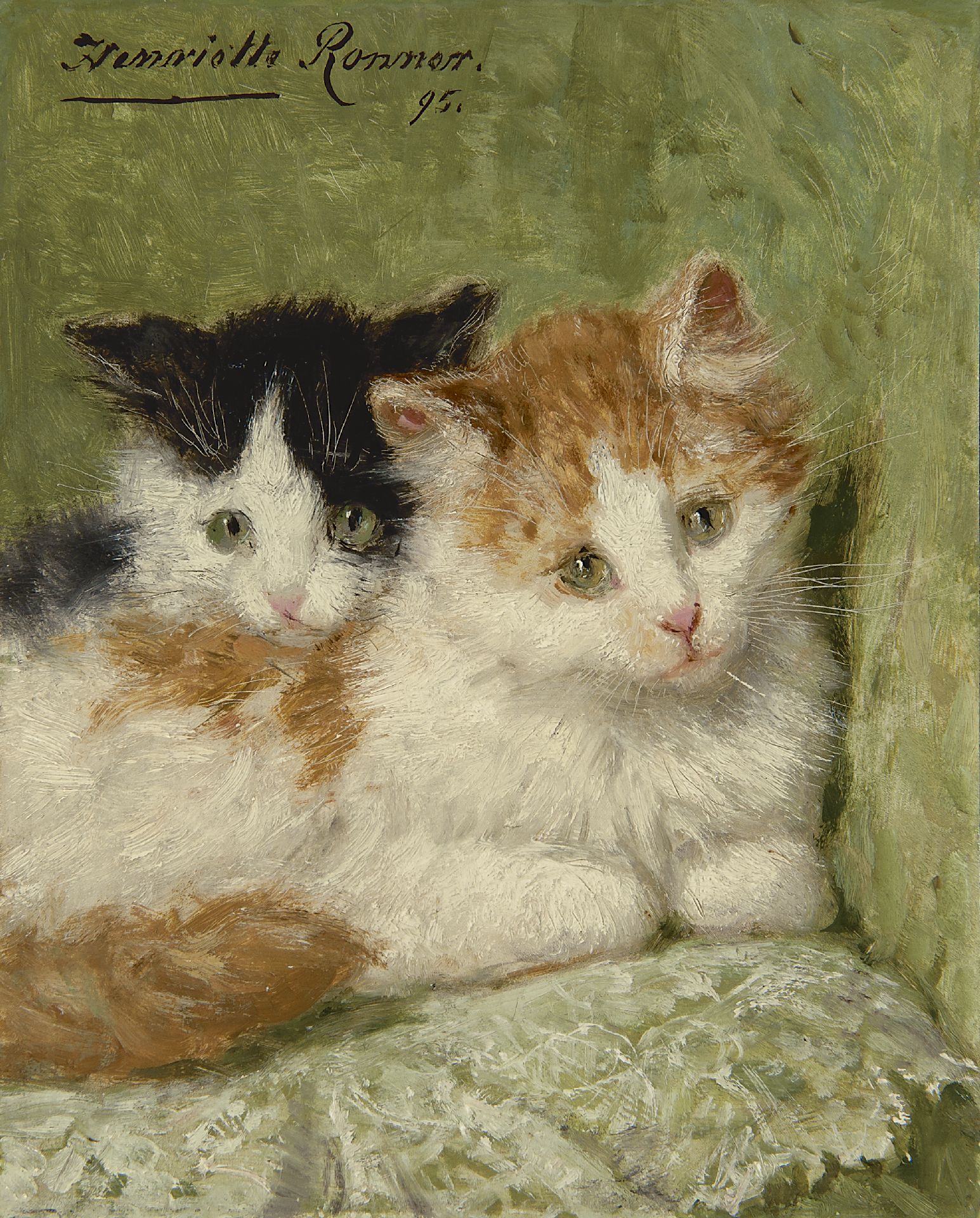 Henriette Ronner Kunstwerk • Gemälde • zuvor zu verkaufen Two kittens sitting on a cushion