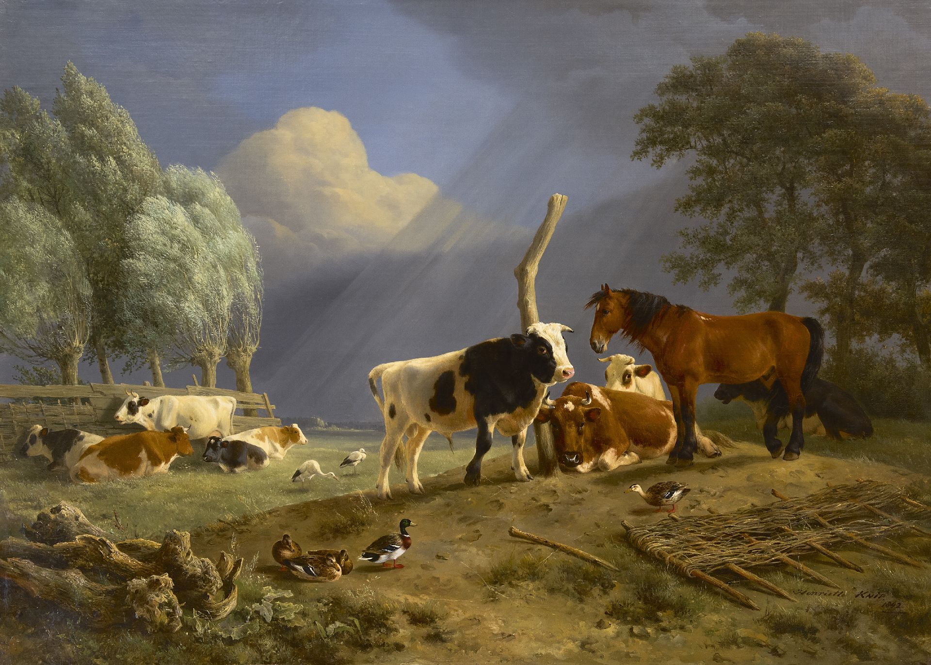 Henriette Ronner Kunstwerk • Gemälde • zuvor zu verkaufen Weidelandschaft mit Pfeerd und Rindvieh bei aufkommendem Sturm