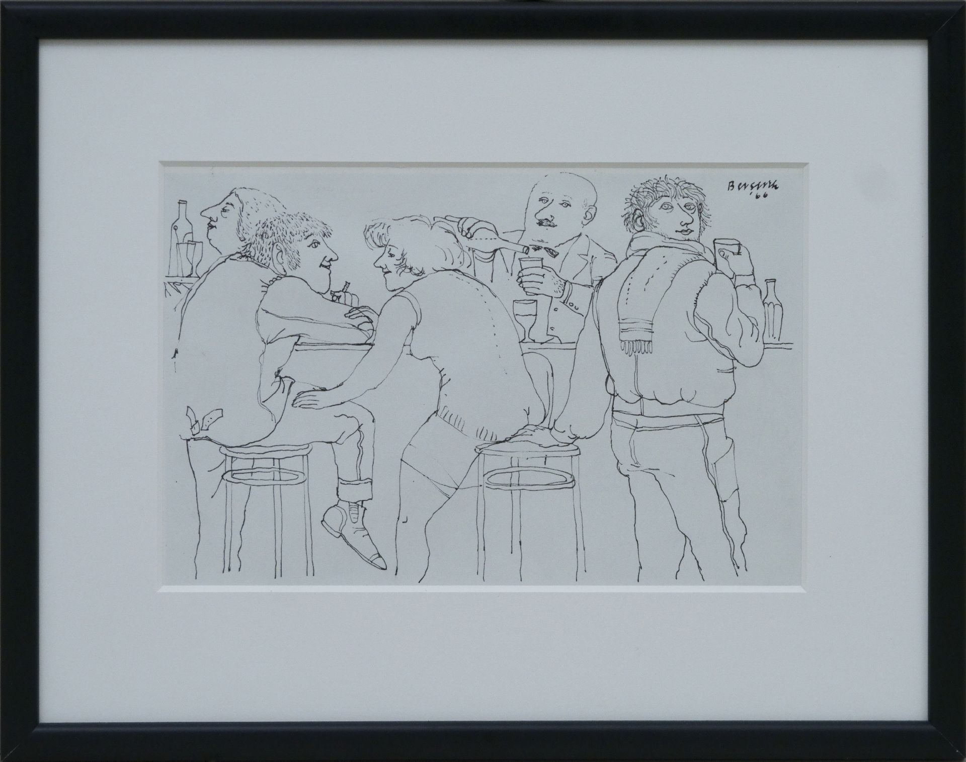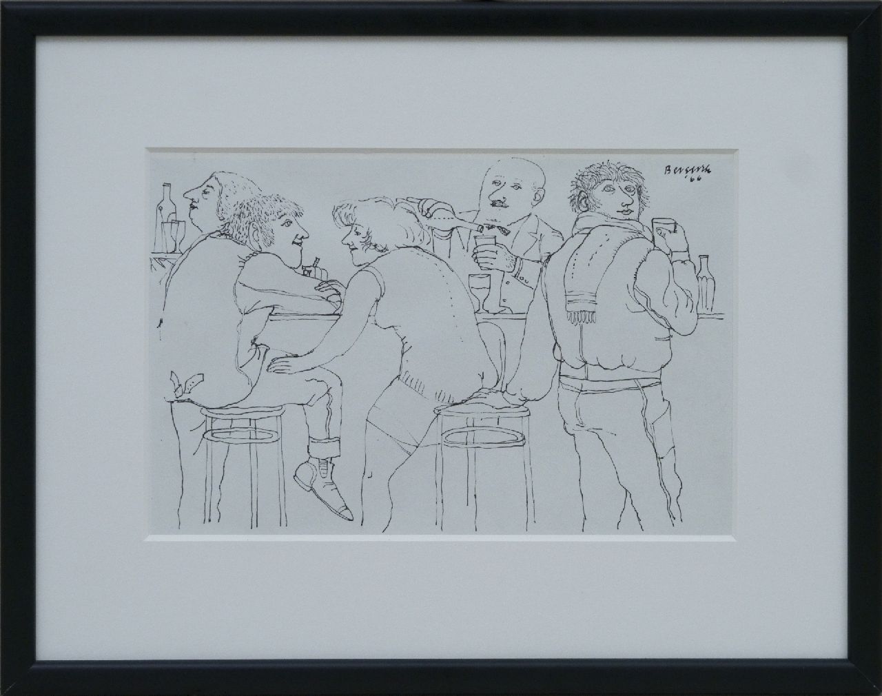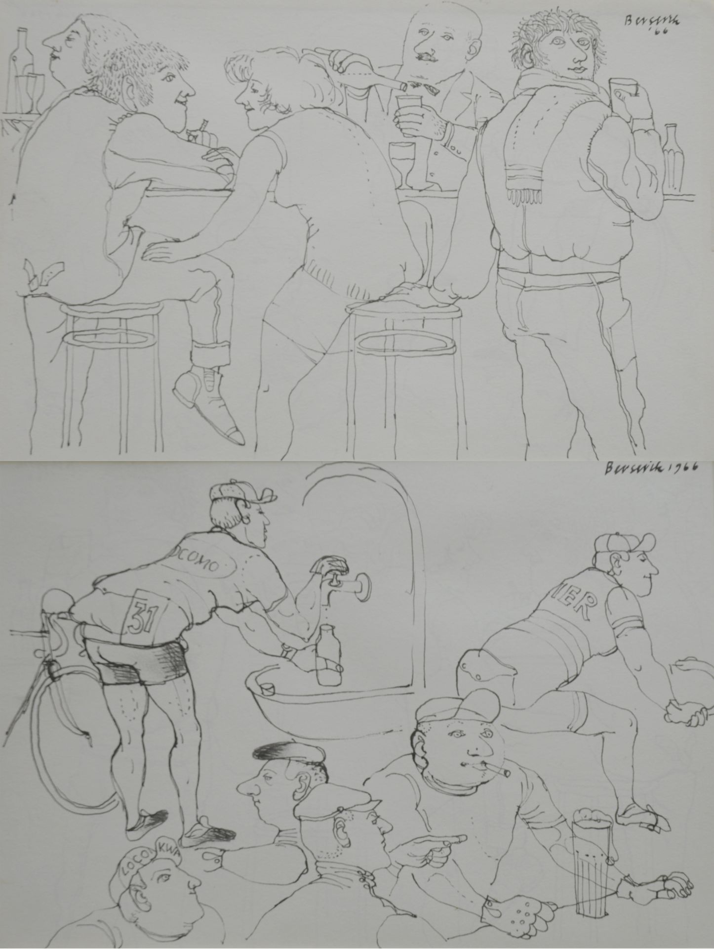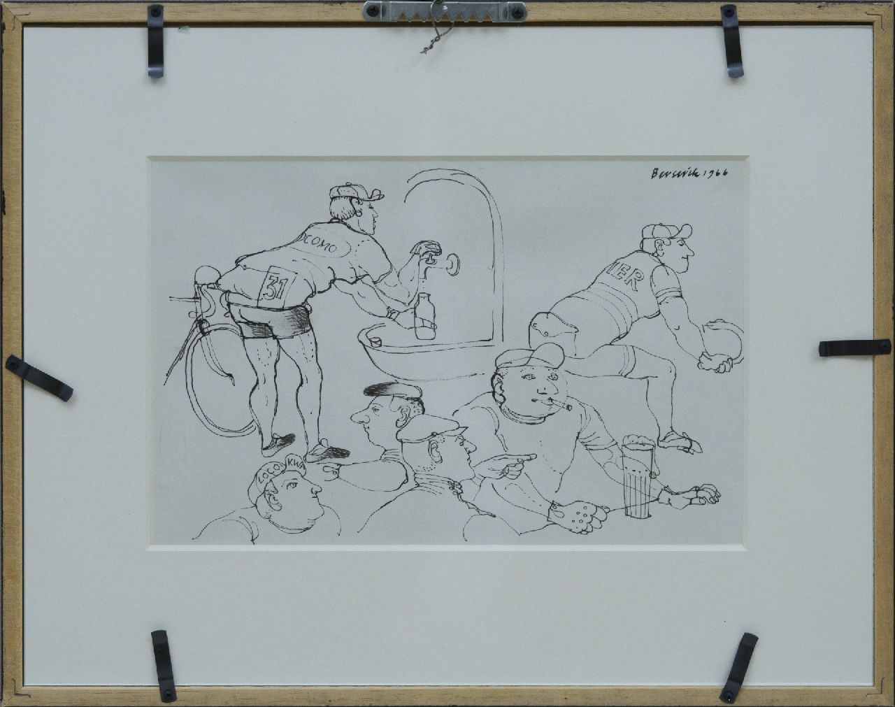 Herman Berserik Kunstwerk • Aquarell • Zeichnung • zu verkaufen An der Bar; im verso Rennradfahrer an der Bar