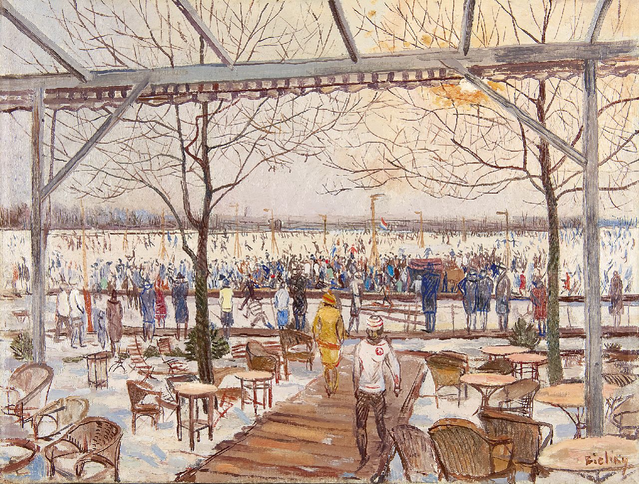 Herman Bieling Kunstwerk • Gemälde • zuvor zu verkaufen Skaters on the Bergse Achterplas near the Plaswijck Paviljoen, Rotterdam