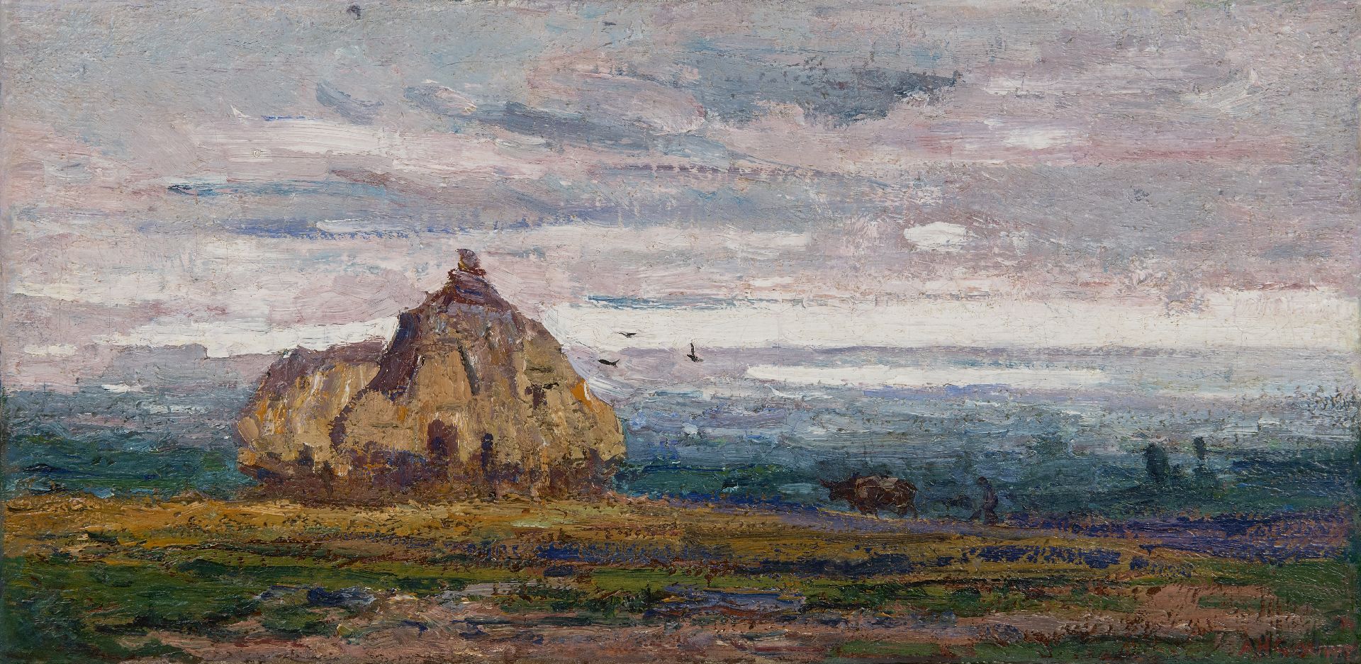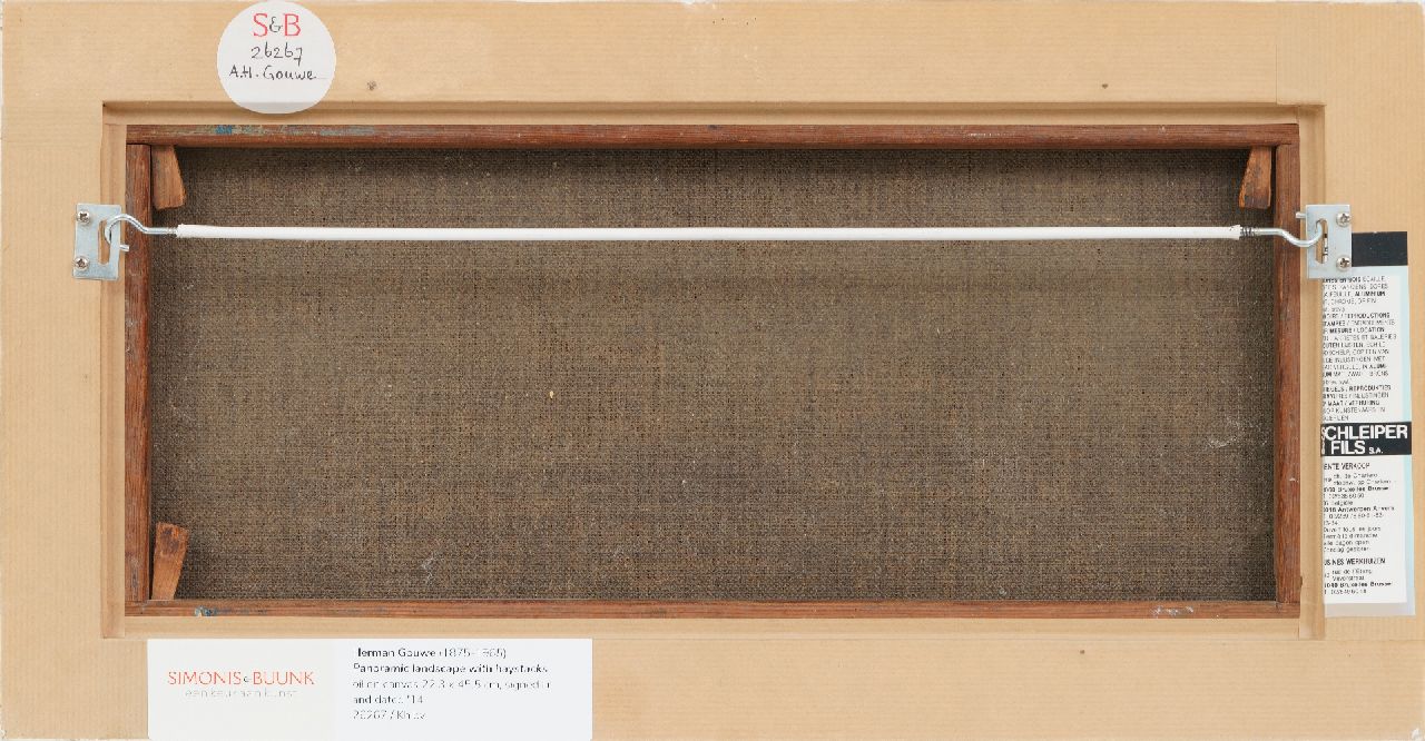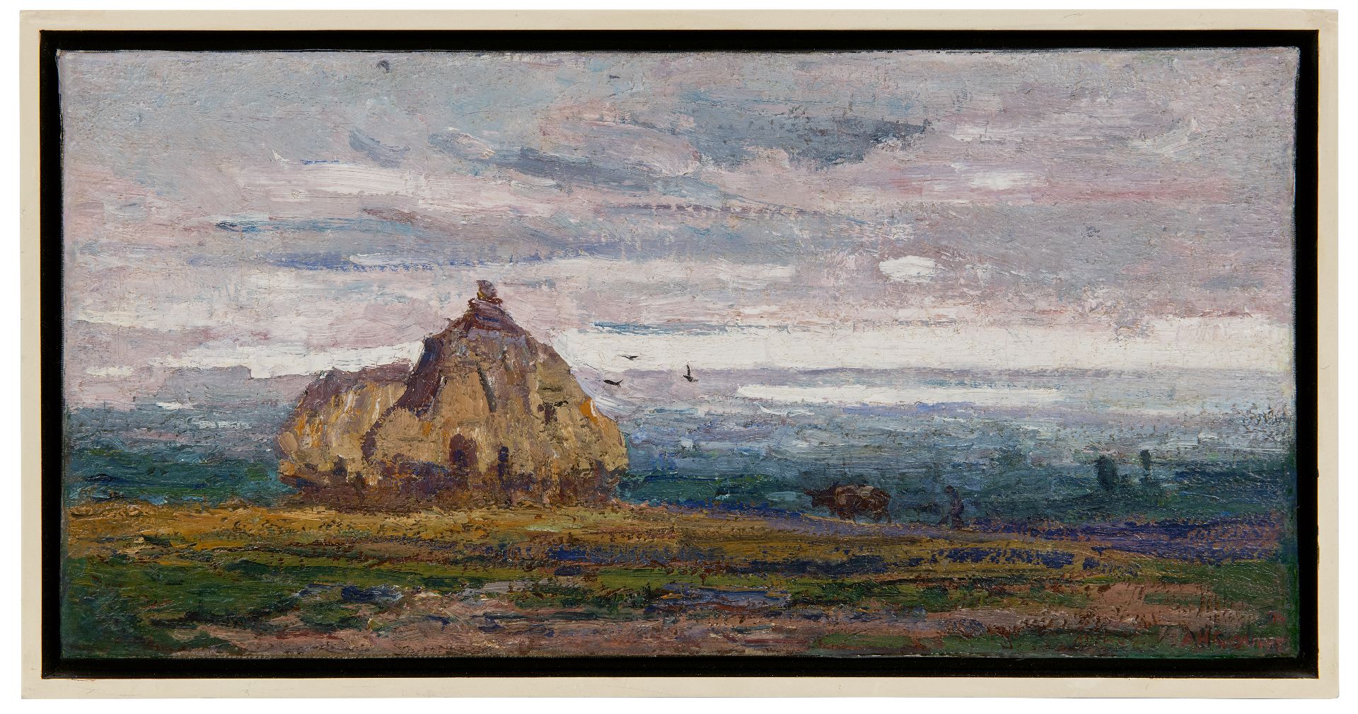 Herman Gouwe Kunstwerk • Gemälde • zuvor zu verkaufen Panoramalandschaft mit Heuhaufen
