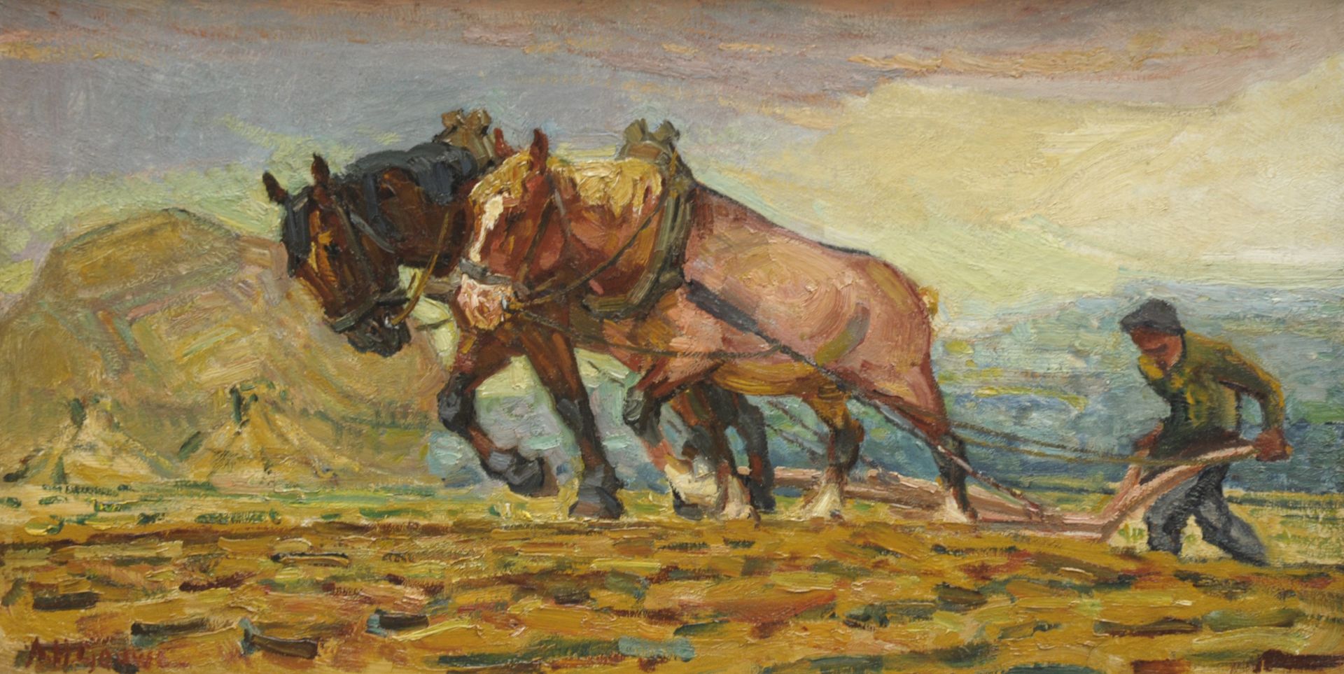 Herman Gouwe Kunstwerk • Gemälde • zuvor zu verkaufen Plowing farmer with two horses