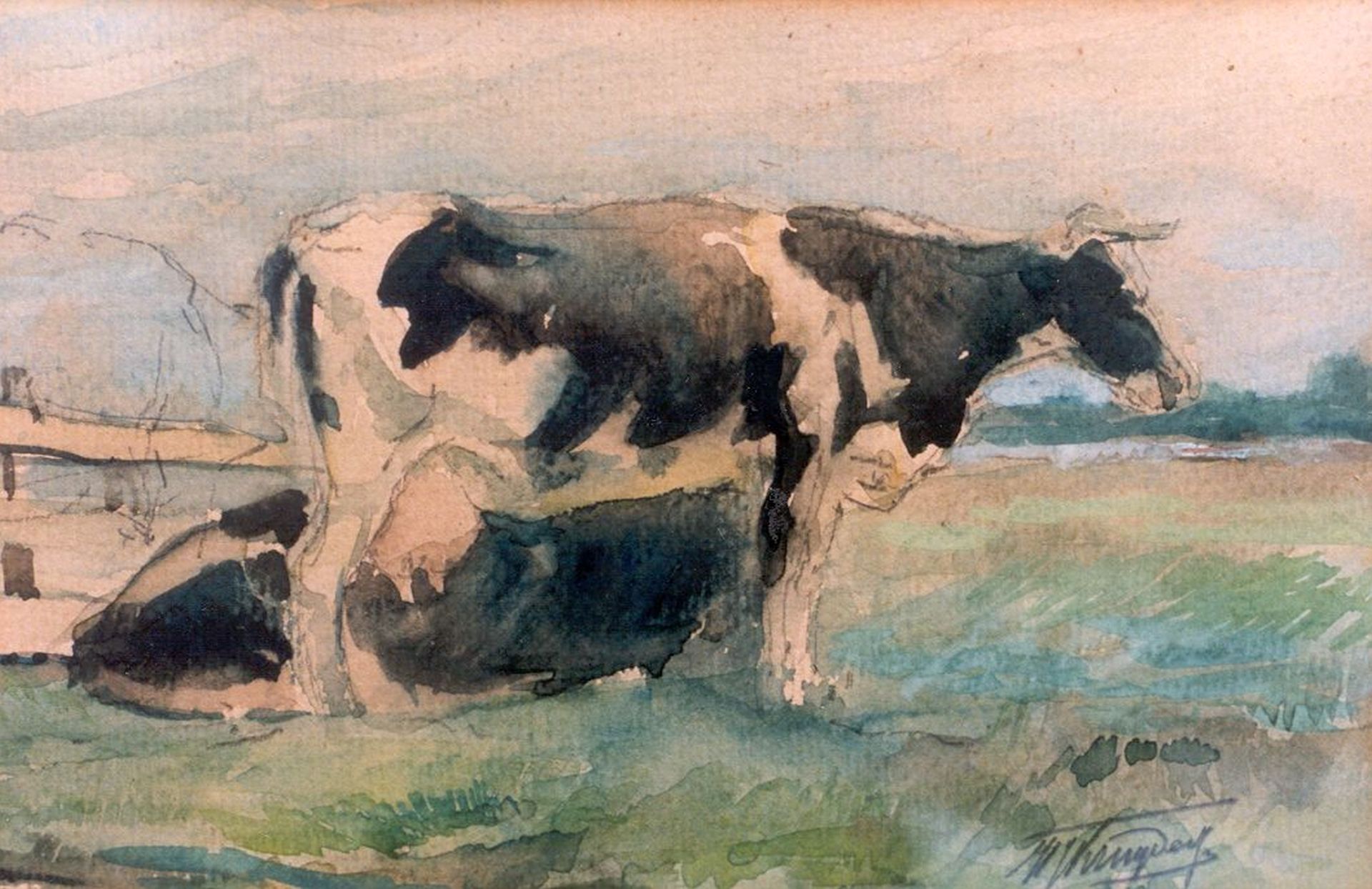 Herman Kruyder Kunstwerk • Aquarell • Zeichnung • zuvor zu verkaufen Cows in a meadow