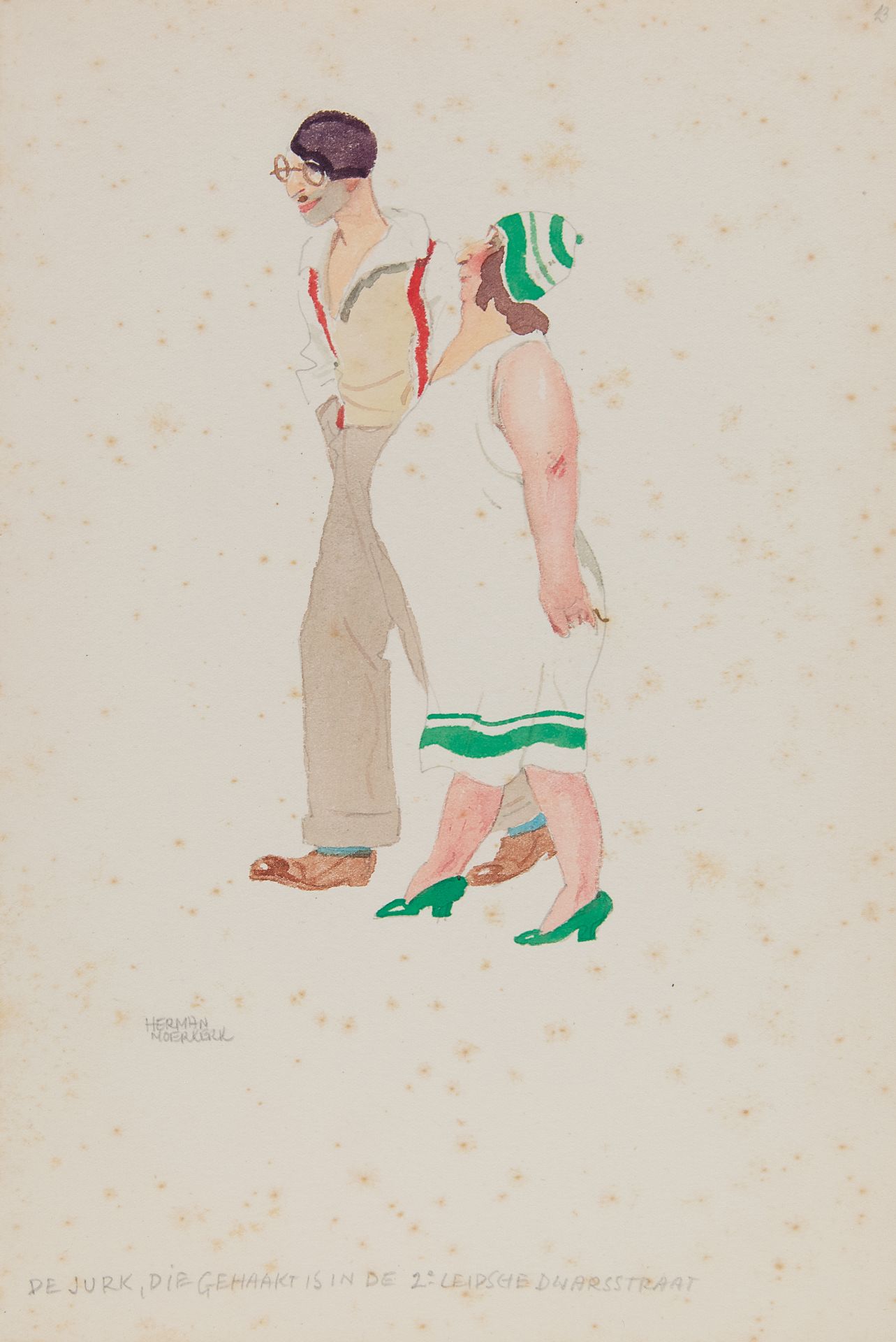 Herman Moerkerk Kunstwerk • Aquarell • Zeichnung • zu verkaufen Amsterdamer flanieren in Zandvoort: das Kleid, das in der 2e Leidsche Dwarsstraat gehäkelt wurde