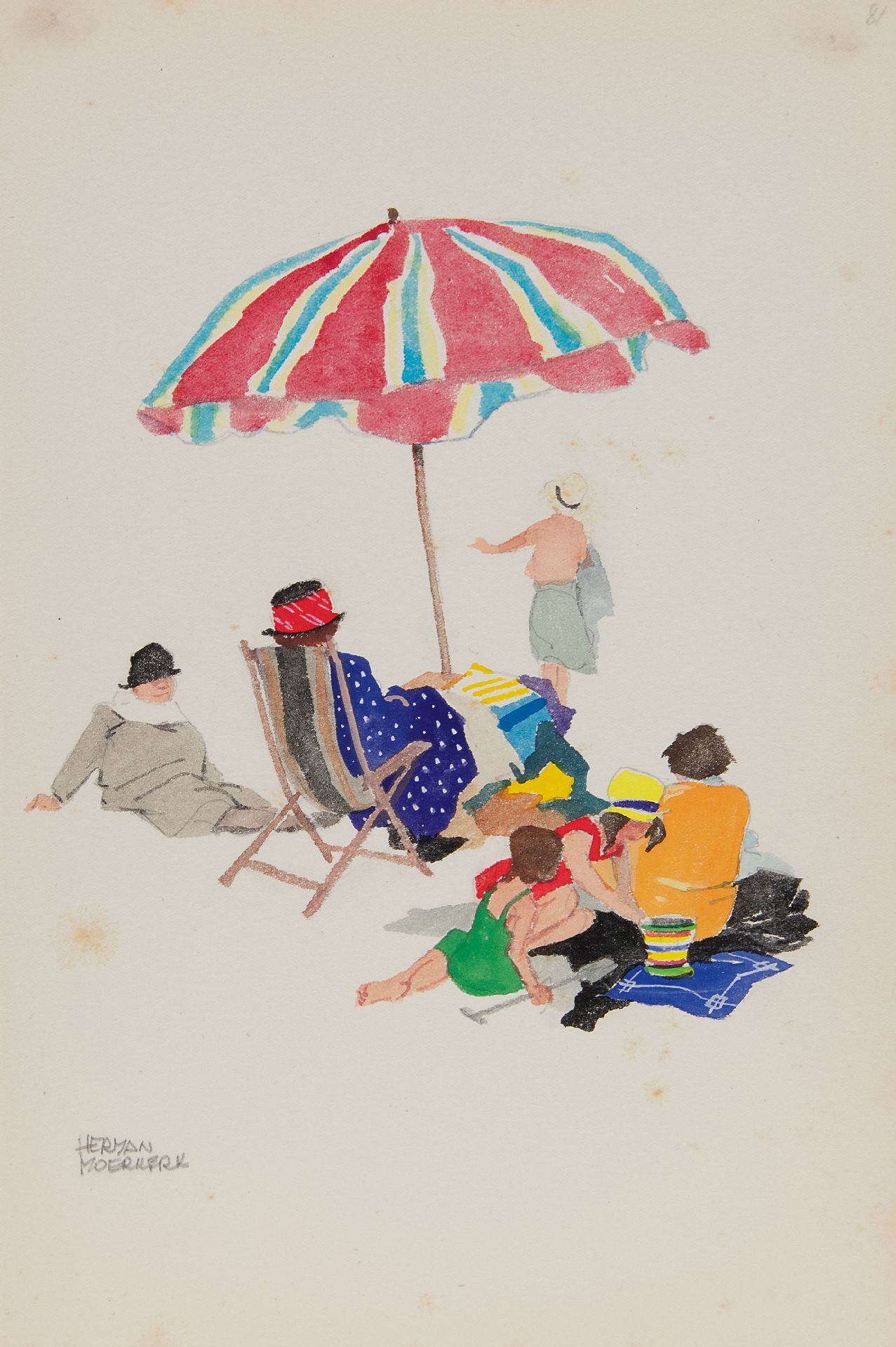 Herman Moerkerk Kunstwerk • Aquarell • Zeichnung • zuvor zu verkaufen Unter Mutters Sonnenschirm in Zandvoort