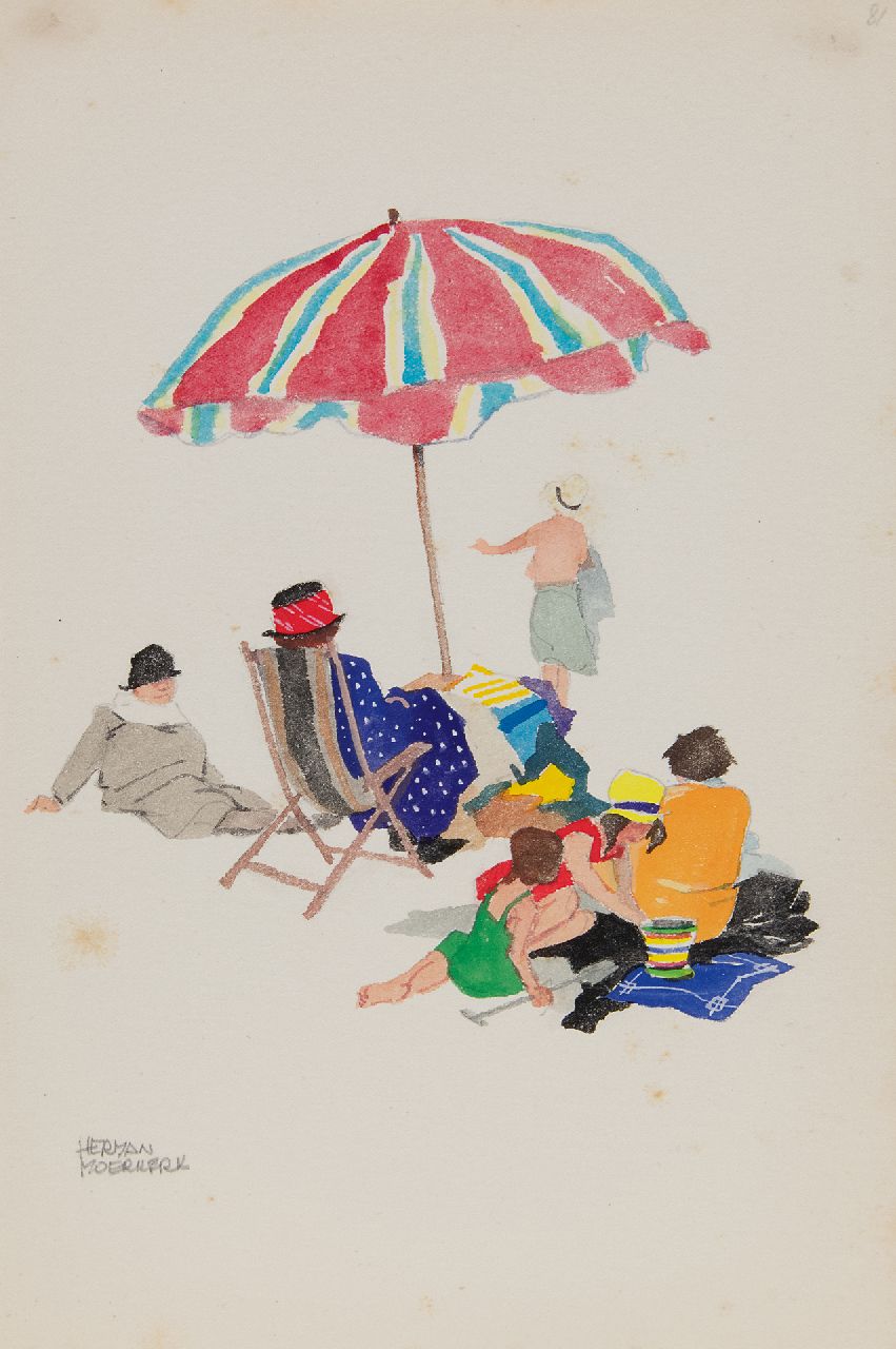Moerkerk H.A.J.M.  | Hermanus Antonius Josephus Maria 'Herman' Moerkerk, Unter Mutters Sonnenschirm in Zandvoort, Bleistift und Aquarell auf Papier 25,5 x 17,1 cm, Unterzeichnet u.l.