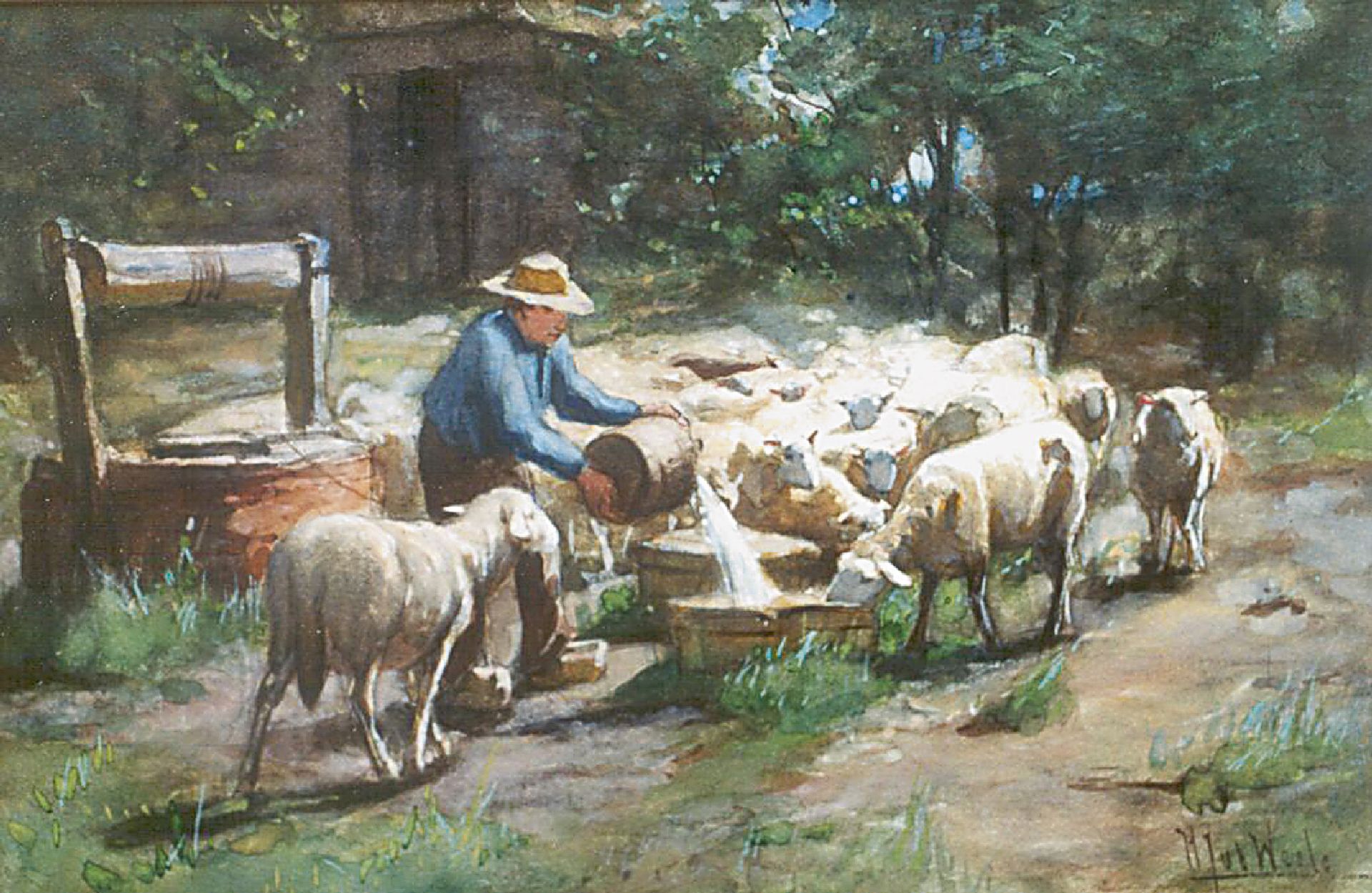 Herman van der Weele Kunstwerk • Aquarell • Zeichnung • zuvor zu verkaufen Sheep with their shepherd near a well
