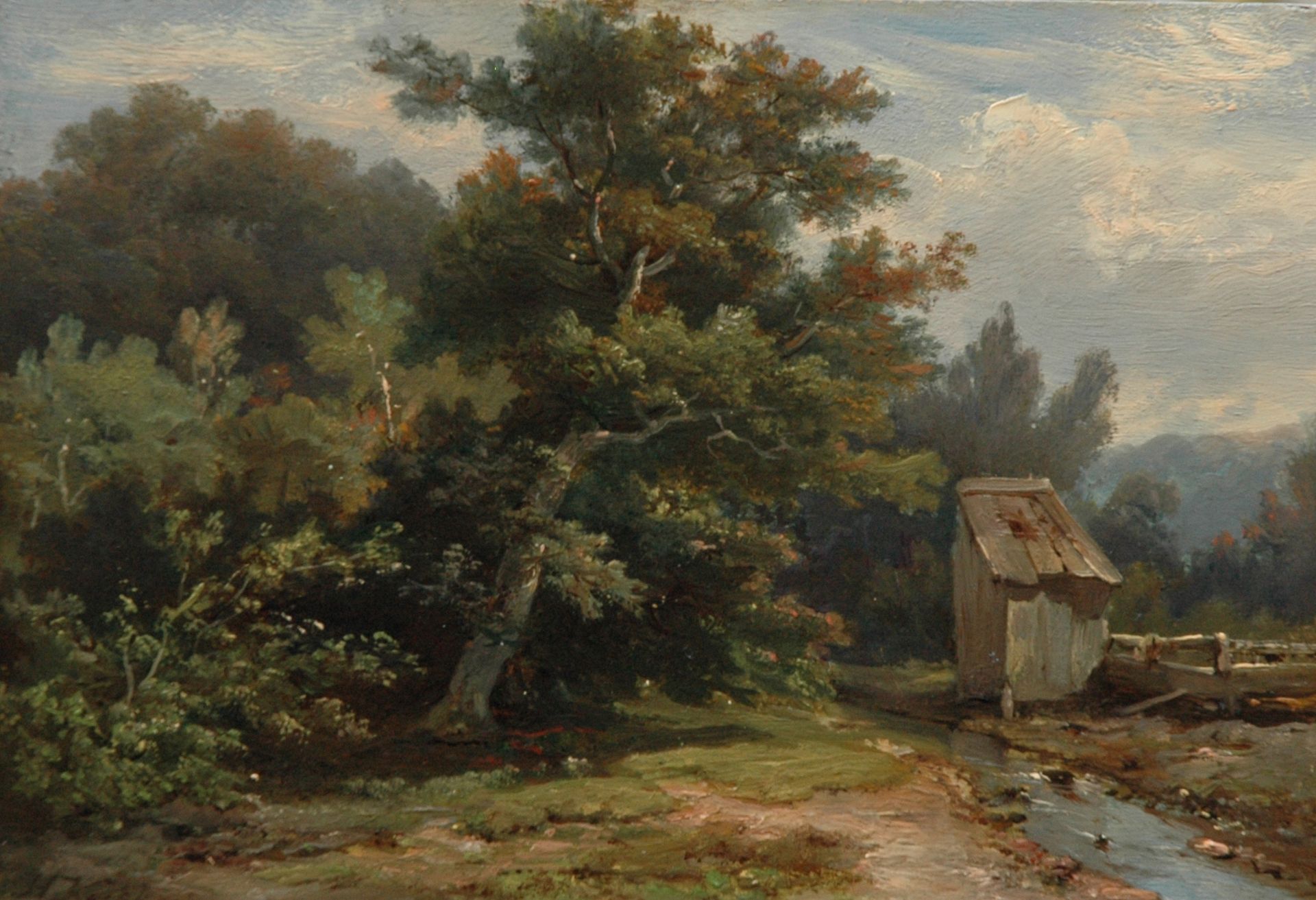 Hermanus Koekkoek Kunstwerk • Gemälde • zuvor zu verkaufen A wooded landscape with a stream and shed
