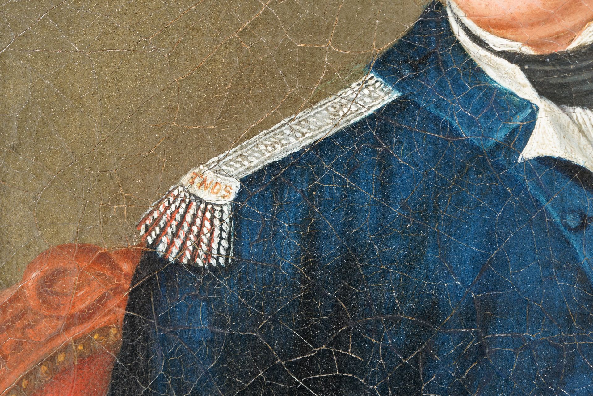 Bis heute konnten wir die Identität des hier abgebildeten Patrioten nicht feststellen. Sicher ist, dass er Mitglied einer der Amsterdamer patriotischen Waffengesellschaften war. Diese Gesellschaften spielten eine wichtige Rolle bei der Rückkehr eines niederländischen Monarchen auf den niederländischen Thron nach dem Abgang von Louis Napoleon. Vermutlich war er Mitglied der Waffengesellschaft Tot Nut der Schutterij. Das Gewehr mit Bajonett zeigt den Rang eines Leutnants, Fähnrichs oder Unteroffiziers an. Die prominent abgebildete Flöte könnte auch darauf hindeuten, dass er ein Pfeifer war. Die Kompanien des 18. Jahrhunderts marschierten mit 2 Trommlern und einem Pfeifer.