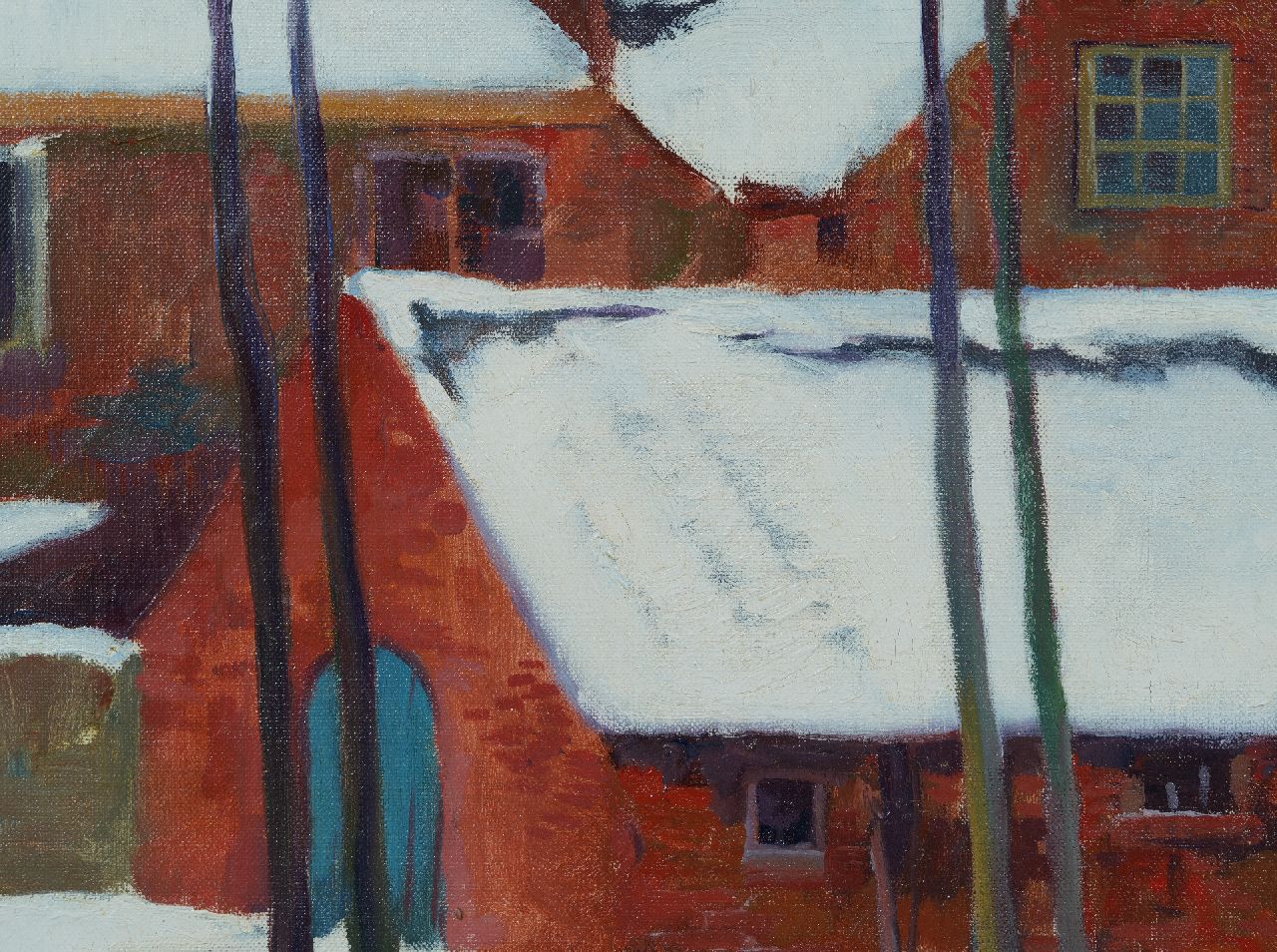 #Huib Luns #Gemälde#Realismus #Dorf #Kirche #Kirchturm #Schnee #Topographie #Winter