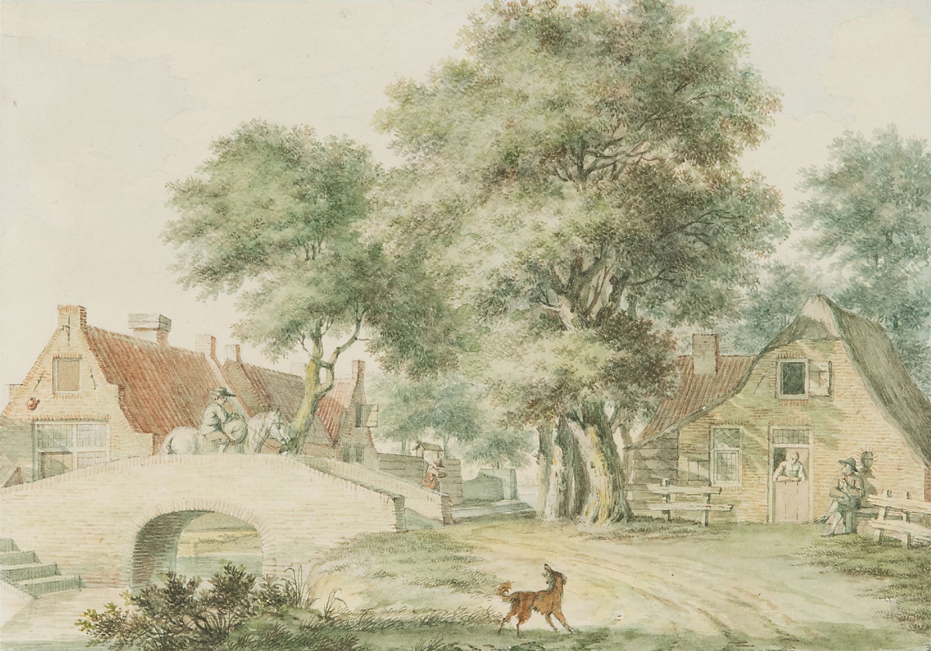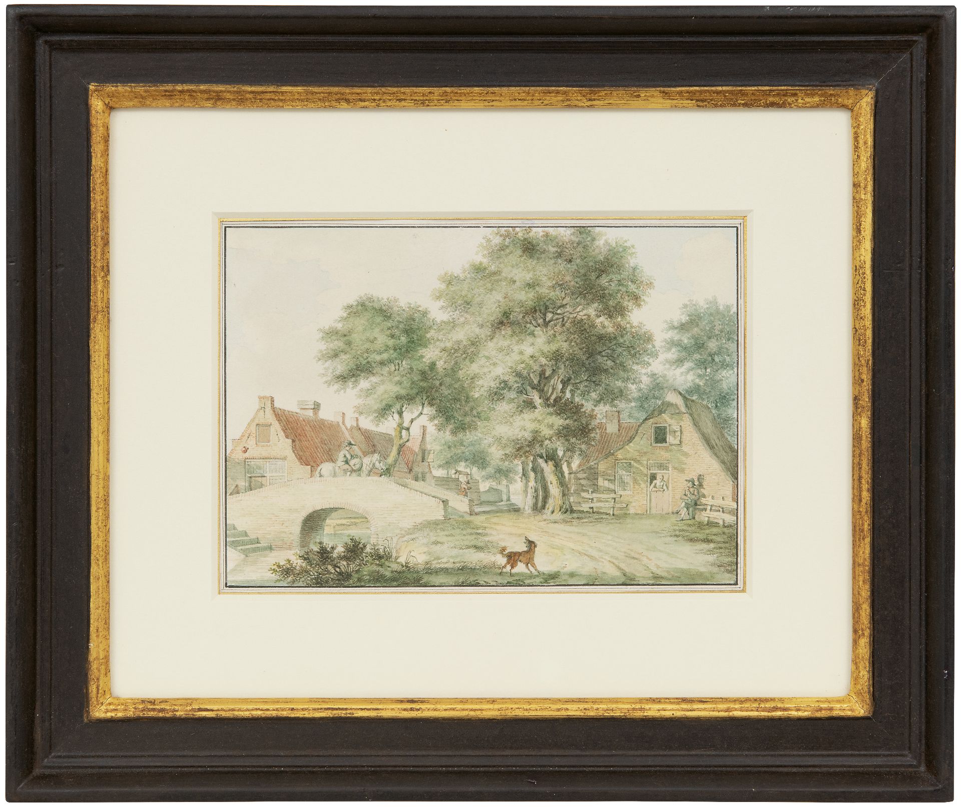 Izaäk Schmidt Kunstwerk • Aquarell • Zeichnung • zu verkaufen Dorfansicht mit Figuren bei einer Steinbrücke