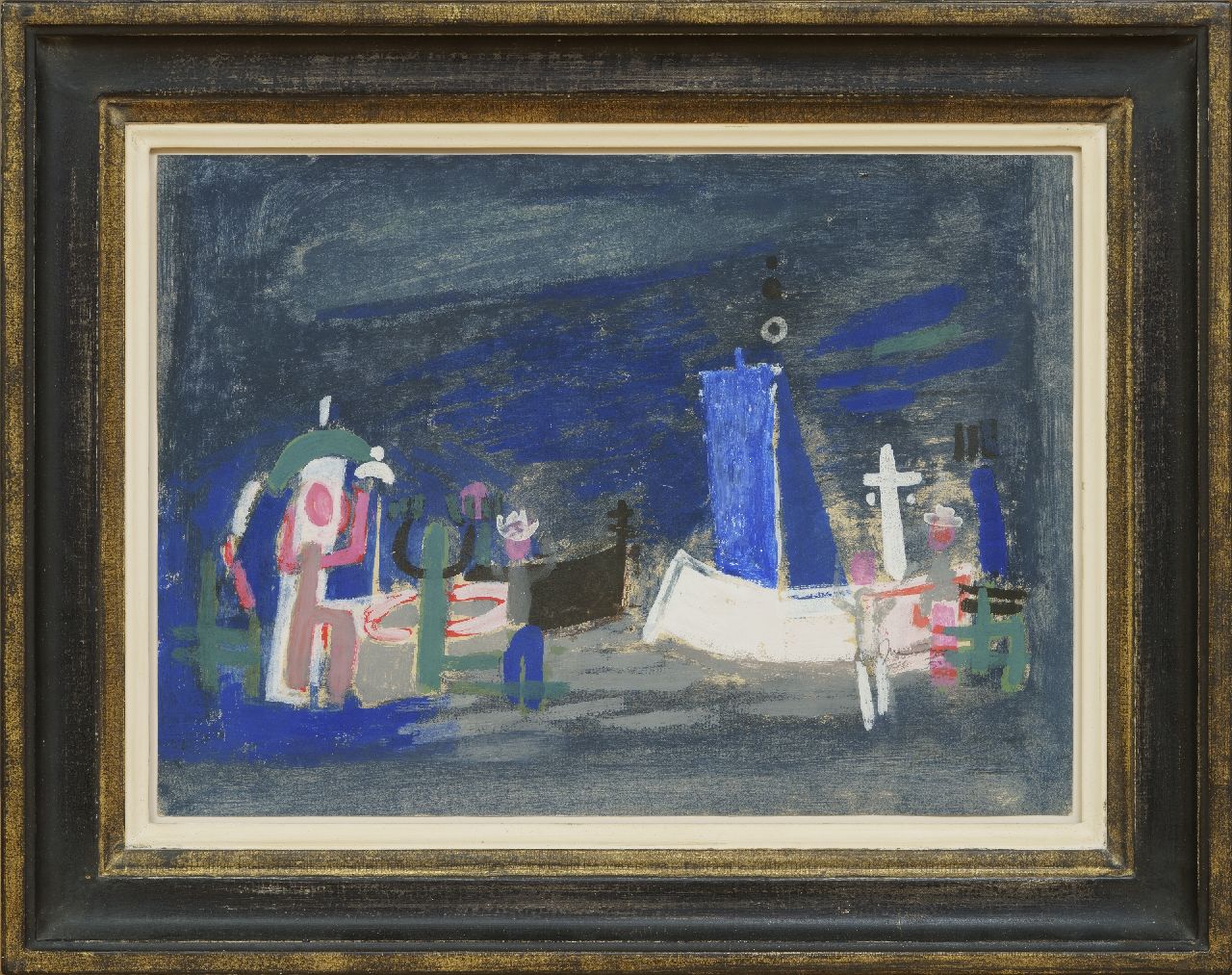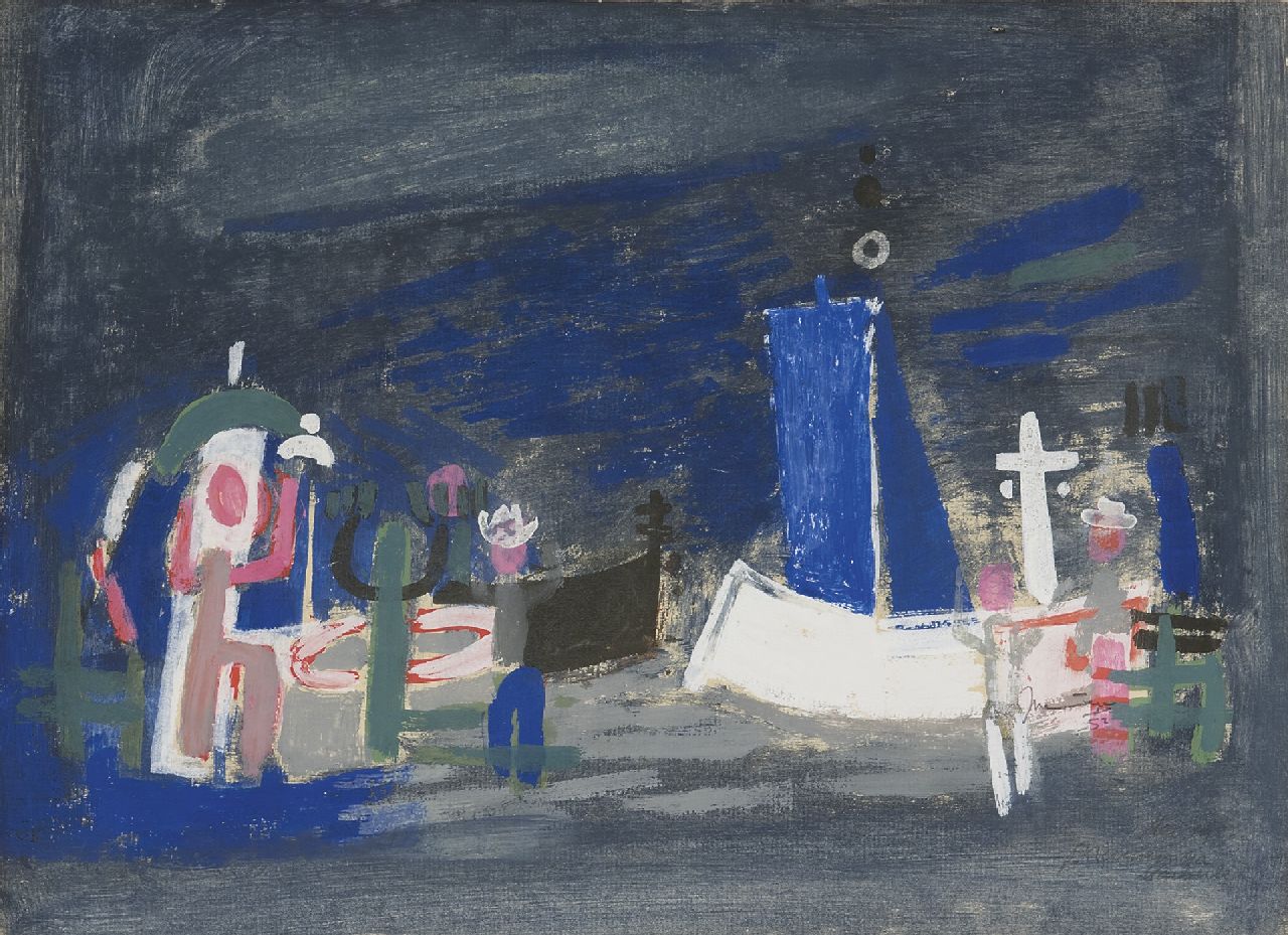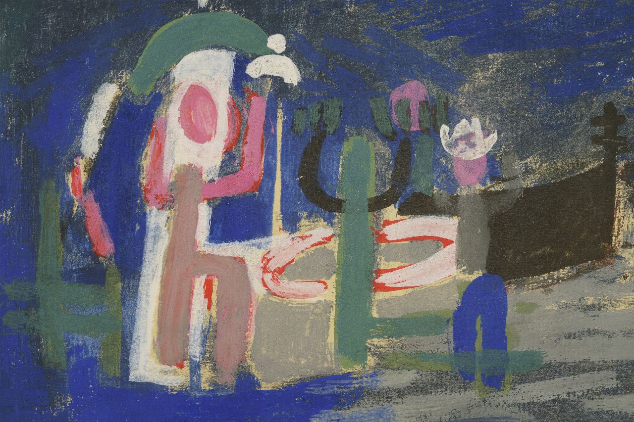 Der Haager Maler Jaap Nanninga gehörte zu den Malern die erst nach dem Zweiten Weltkrieg den Schritt von figurativ nach abstrakt machten. Er wurde u.a. In seiner Entwicklung durch die absstrakten Werke von Geer van Velde beeinflusst, dem er 1946 in Südfrankreich begegnete. Nanninga baute seine Kompositionen aus Formen auf, die er intuitiv auf die Leinwand brachte.