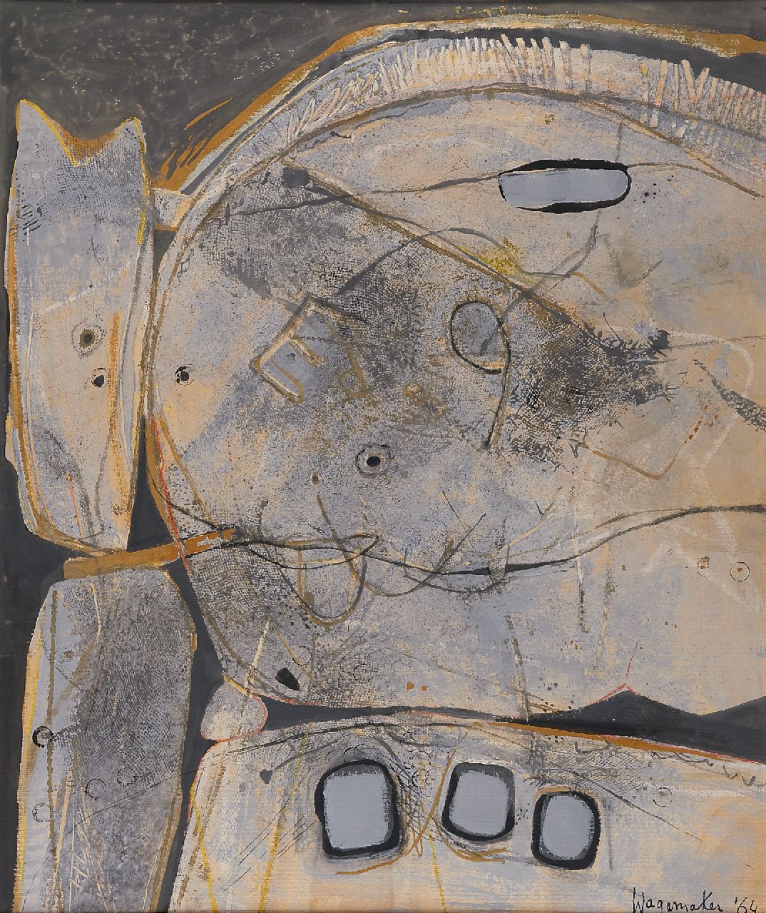 Jaap Wagemaker ist vor allen Dingen als Materiemaler bekannt. In dieser Eigenschaft gehörte er zusammen mit Jean Dubuffet, Alberto Burri und Antoni Tàpies zu der kleinen Gruppe von Künstlern die diese Strömung ab Ende der fünfziger Jahre weltweit repräsentieren. In der vorangehenden Periode, ab 1946 experimentierte er unter dem Einfluss der Werke von Paul Klee mit einer höchst persönlichen Bildsprache von Phantasiezeichen und Strichen scheinbar willkürlich entstanden waren.