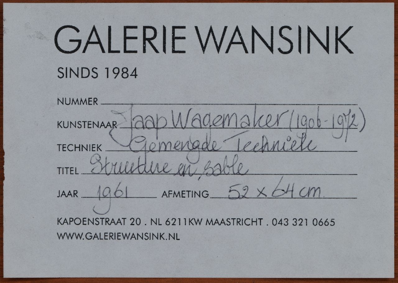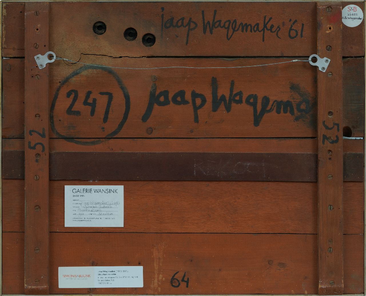 Jaap Wagemaker ist vor allen Dingen als Materiemaler bekannt. In dieser Eigenschaft gehörte er zusammen mit Jean Dubuffet, Alberto Burri und Antoni Tàpies zu der kleinen Gruppe von Künstlern die diese Strömung ab Ende der fünfziger Jahre weltweit repräsentieren. In der vorangehenden Periode, ab 1946 experimentierte er unter dem Einfluss der Werke von Paul Klee mit einer höchst persönlichen Bildsprache von Phantasiezeichen und Strichen scheinbar willkürlich entstanden waren.