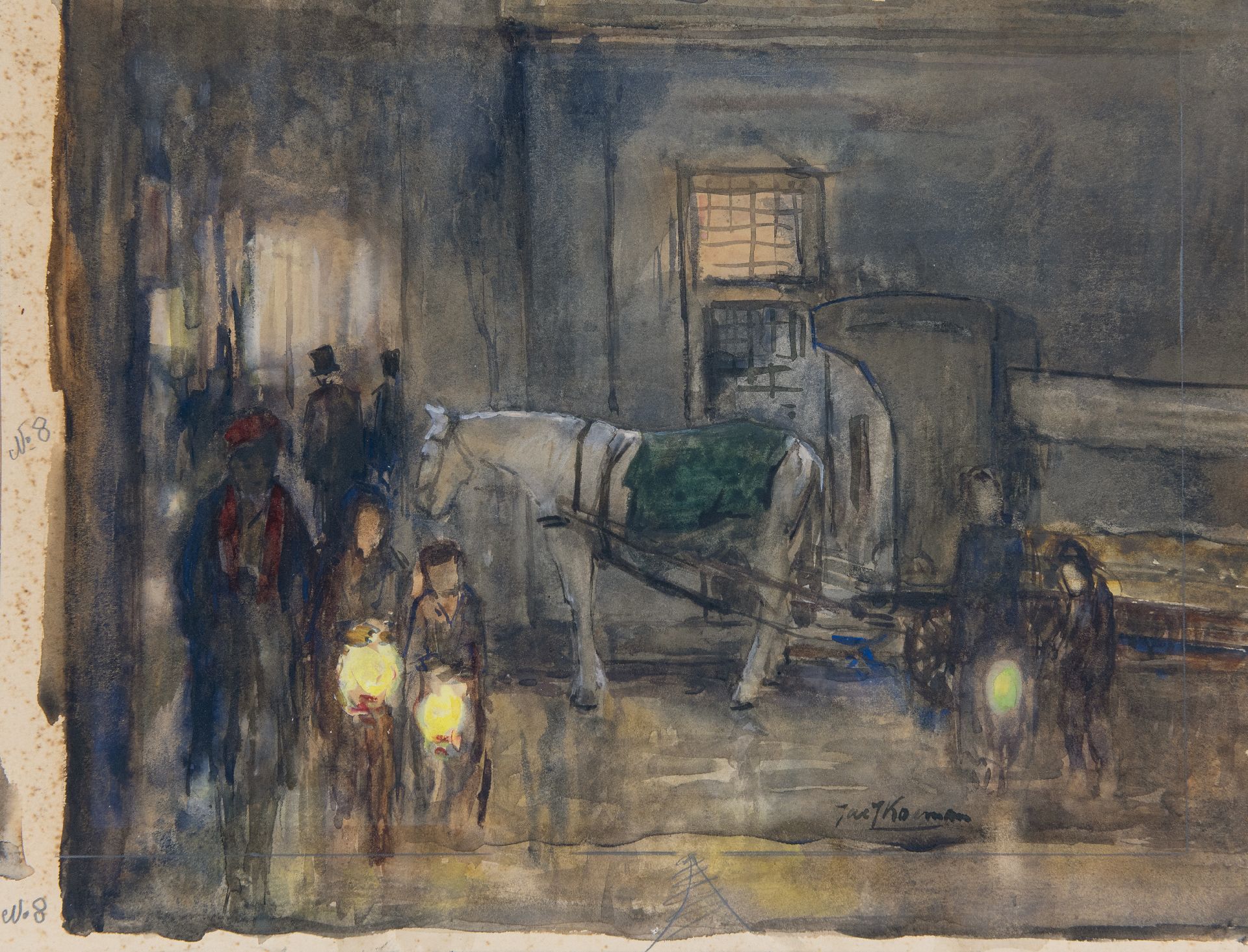 Jac. J. Koeman Kunstwerk • Aquarell • Zeichnung • zu verkaufen Straßenszene mit Figuren und Pferdewageim Abend