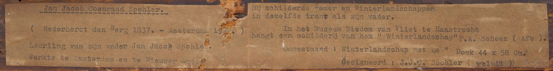 Jacob Jan Coenraad Spohler bekam Unterricht von seinem Vater Jan Jacob und erwies sich als ein guter Schüler da er sich auch spezialisierte auf die Landschaft, wie Sommer- und Winteransichten. Vor allen Dingen malte er Eisvergnügen mit vielen Figuren: beschneite Ländereien den spiegelnden Eisflächen entlang mit gleitenden Schlittshuhläufern und einer Koek-en-Zopie-Bude , in endlosen Variationen dargestellt. J.J.C. Spohler wohnte und arbeitete in Amsterdam und hatte regelmässig Ausstellungen, unter anderem bei den Tentoonstellingen van Levende Meesters.
