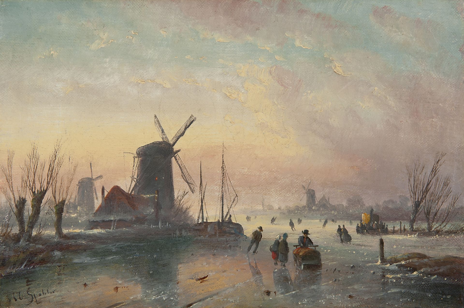 Jacob Jan Coenraad Spohler Kunstwerk • Gemälde • zuvor zu verkaufen Eisansicht mit Schlittschuhläufern