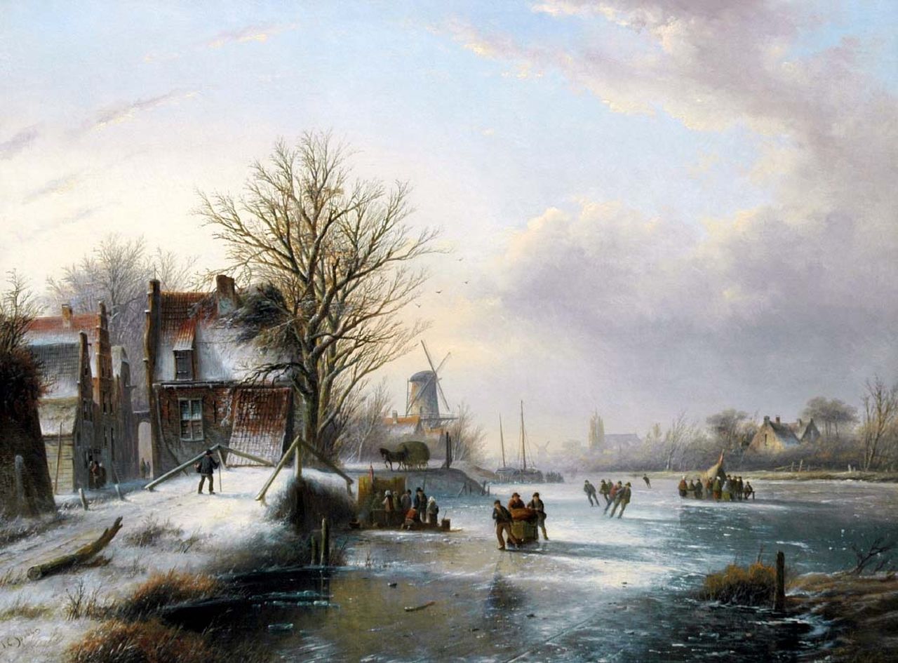 Jacob Jan Coenraad Spohler Kunstwerk • Gemälde • zuvor zu verkaufen Skaters on a frozen waterway