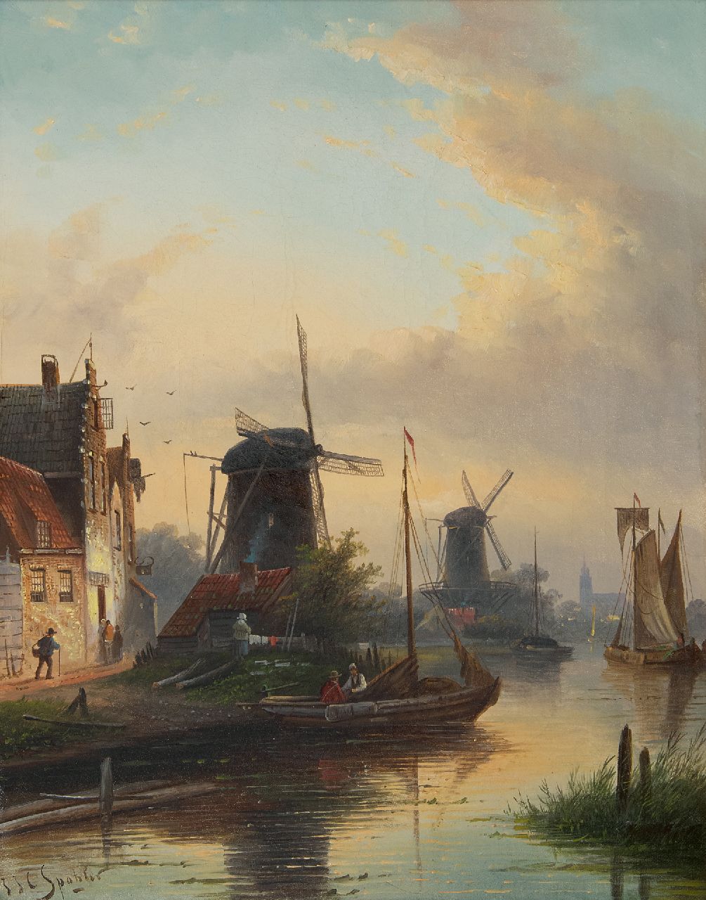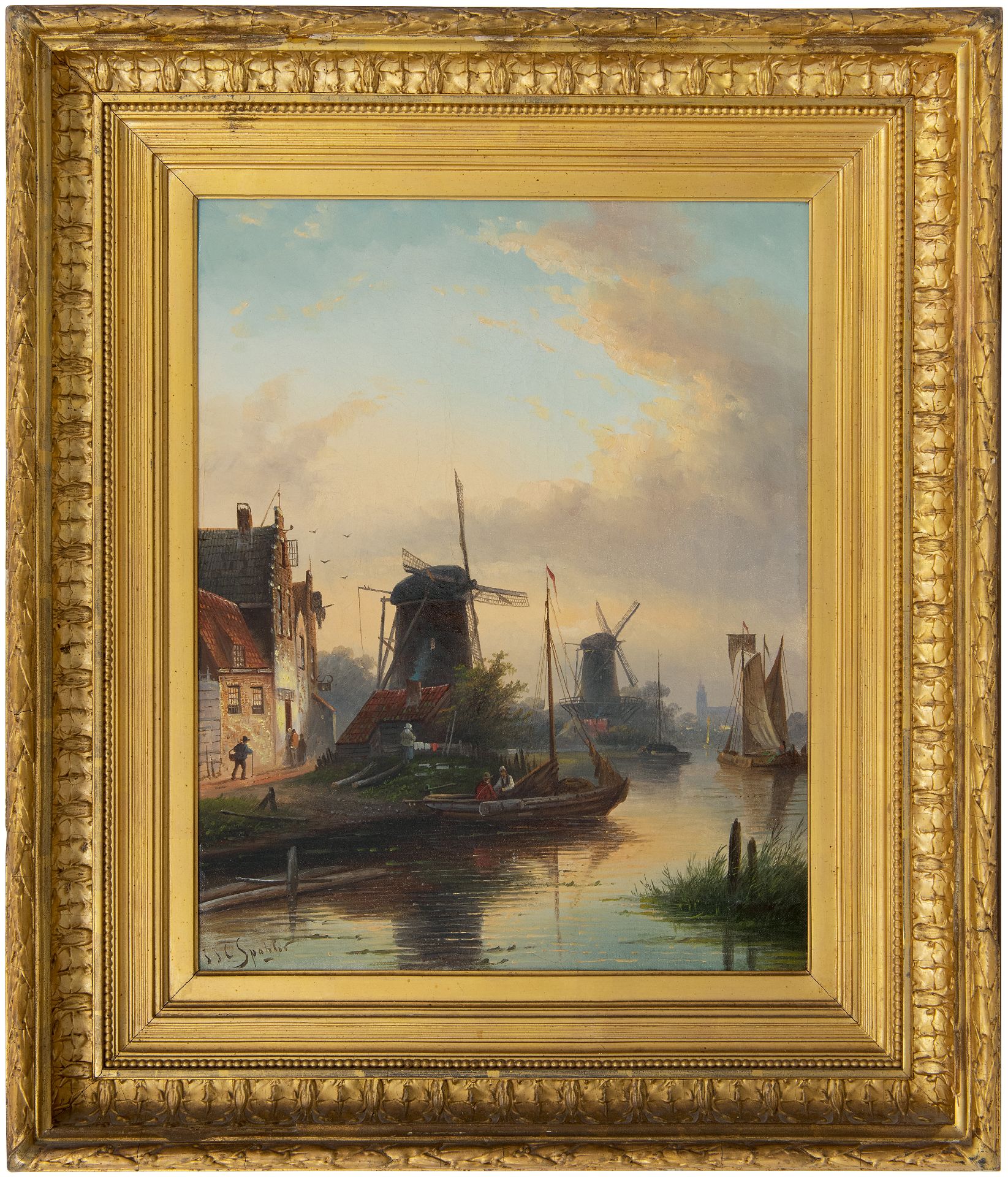 Jacob Jan Coenraad Spohler Kunstwerk • Gemälde • zuvor zu verkaufen Sommerliche Flussansicht mit Mühlen