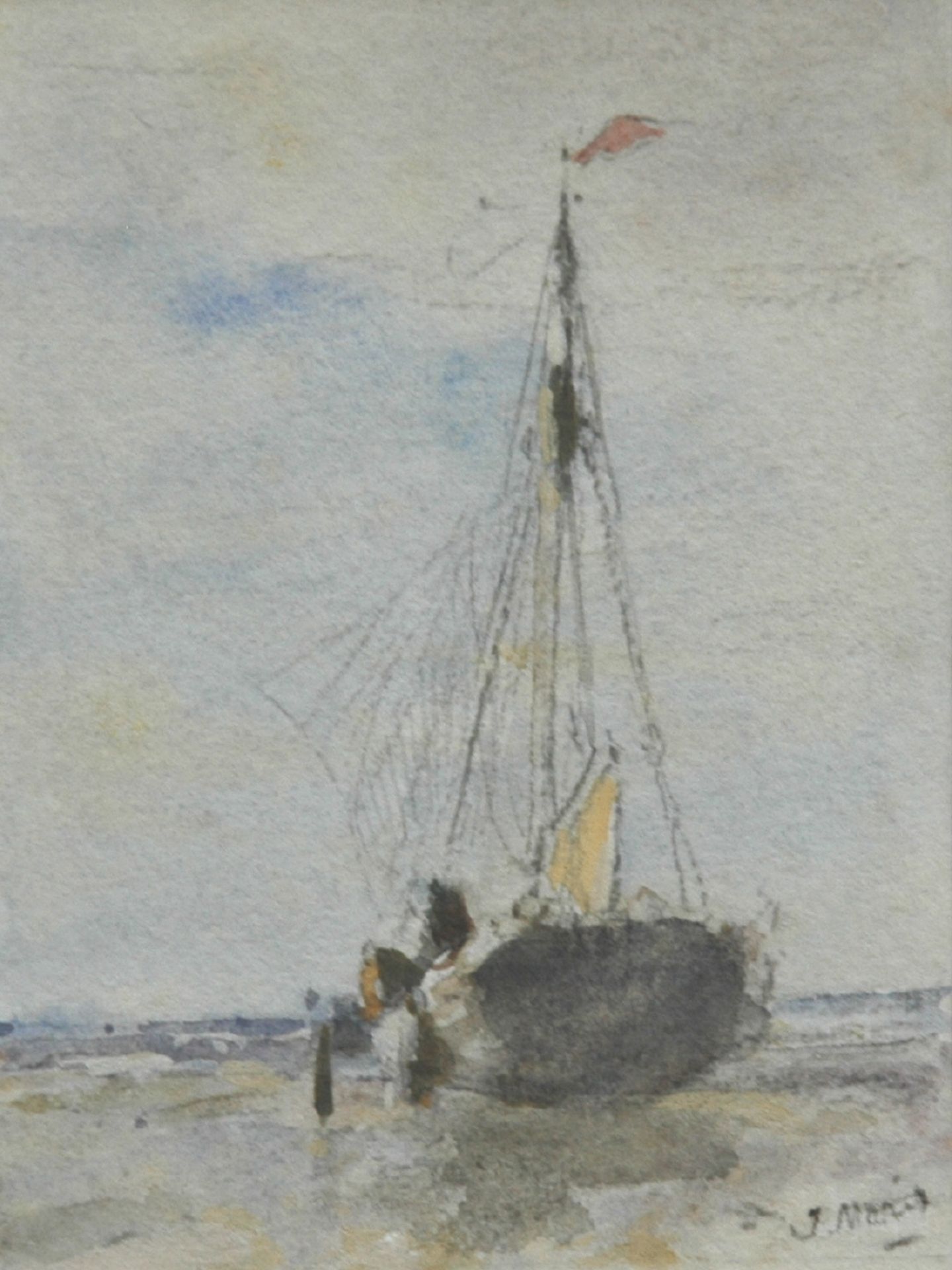 Jacob Maris Kunstwerk • Aquarell • Zeichnung • zuvor zu verkaufen A menu with a watercolour of a barge on the beach