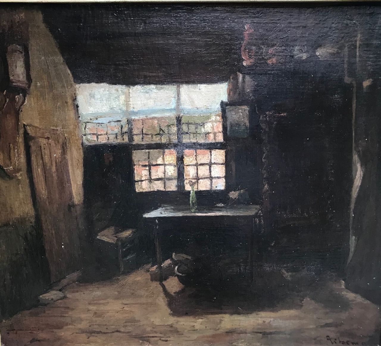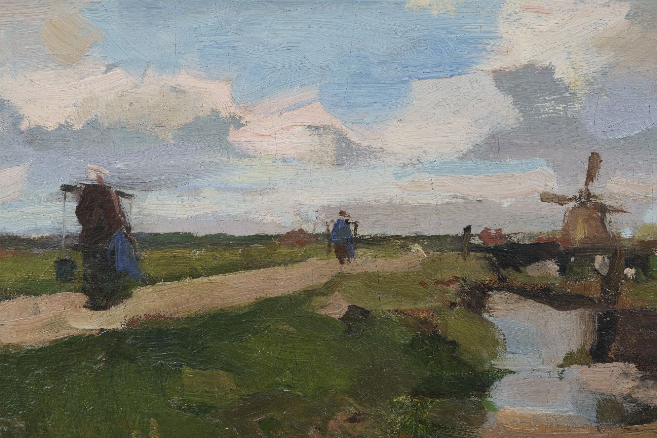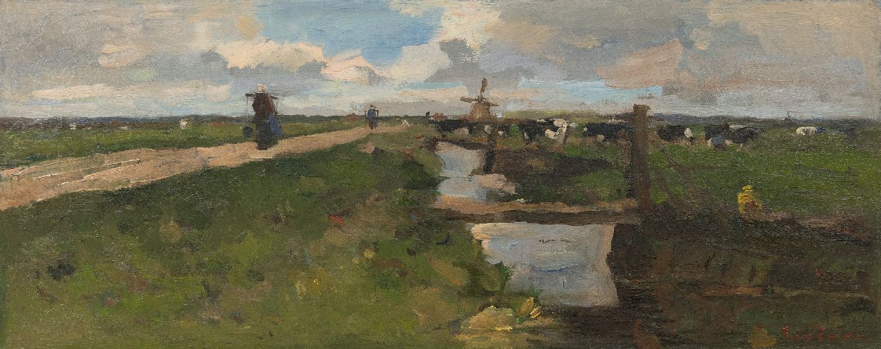 Jacob Coenraad Ritsema, Bruder von Jacoba Johanna (Coba) Ritsema, war zu seiner Zeit ein weithin geschätzter Landschaftsmaler. Der junge Ritsema wurde bei P.J.C. Gabriel und er folgten seinem Lehrer auf seinen Studienreisen durch das Land. Ritsema verschönerte die Natur nicht und fügte keine kompositorischen Details hinzu: Er sah und malte die unmittelbare Schönheit sumpfiger grüner Polder, den imposanten grauen Wolkenhimmel und die weißen Zugbrücken, die sich von ihnen abhoben. In seinen Gemälden versteht er es sehr gut, die Einfachheit, Stille und Ruhe der Landschaft zu vermitteln. Meer over deze brontekstBrontekst vereist voor aanvullende vertaalinformatie Feedback sturen Zijvensters