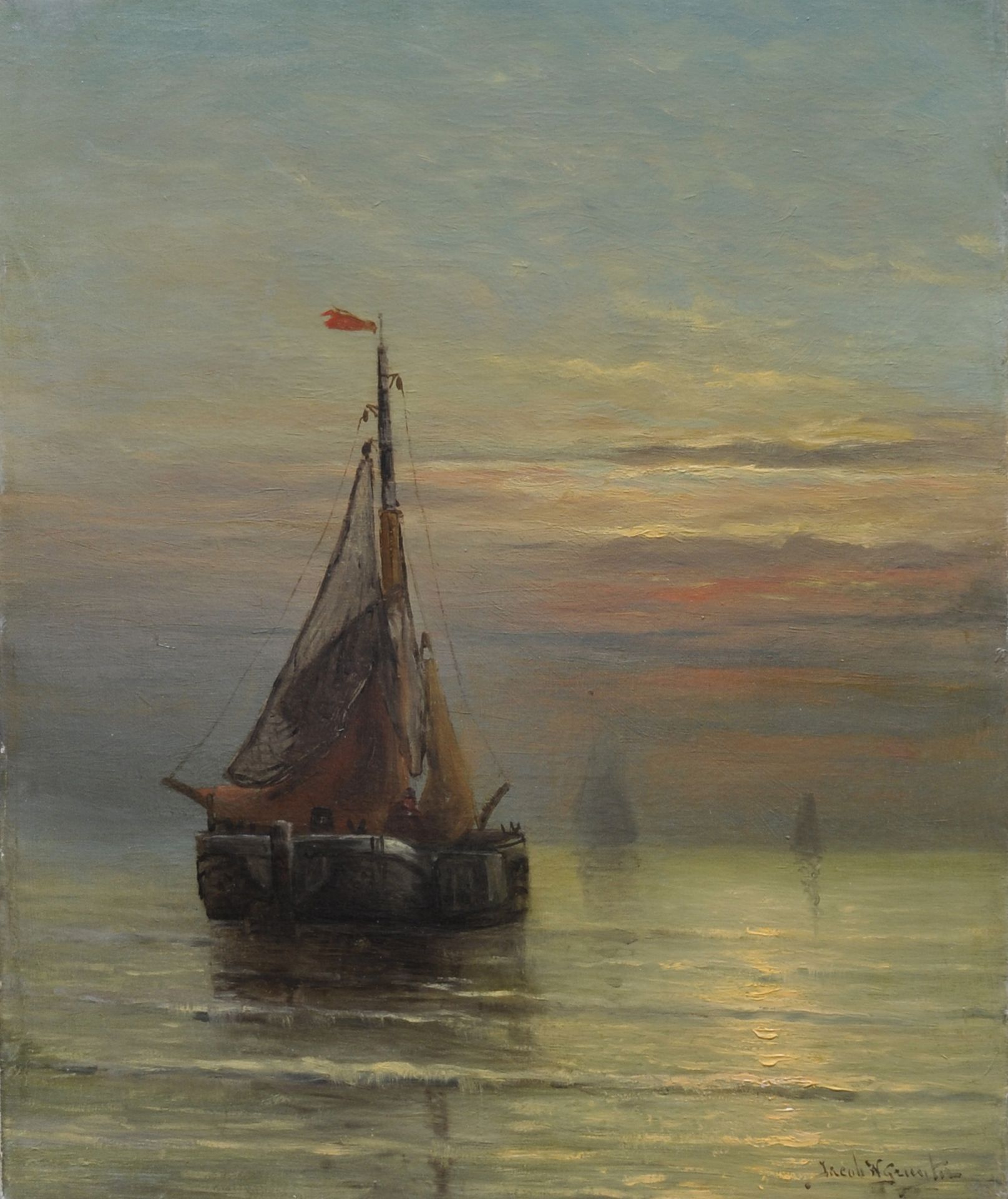 Jacob Willem Gruijter Kunstwerk • Gemälde • zuvor zu verkaufen Fischerboote vor der holländischen Küste bei Sonnenuntergang