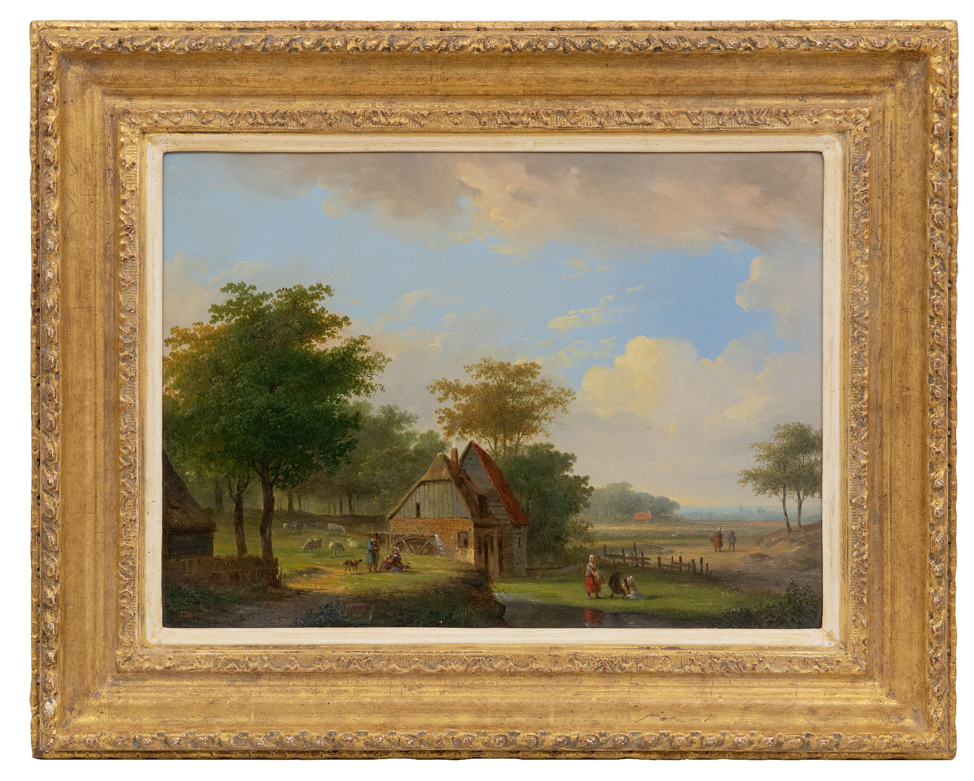Idyllic landscape with a water mill and country folk