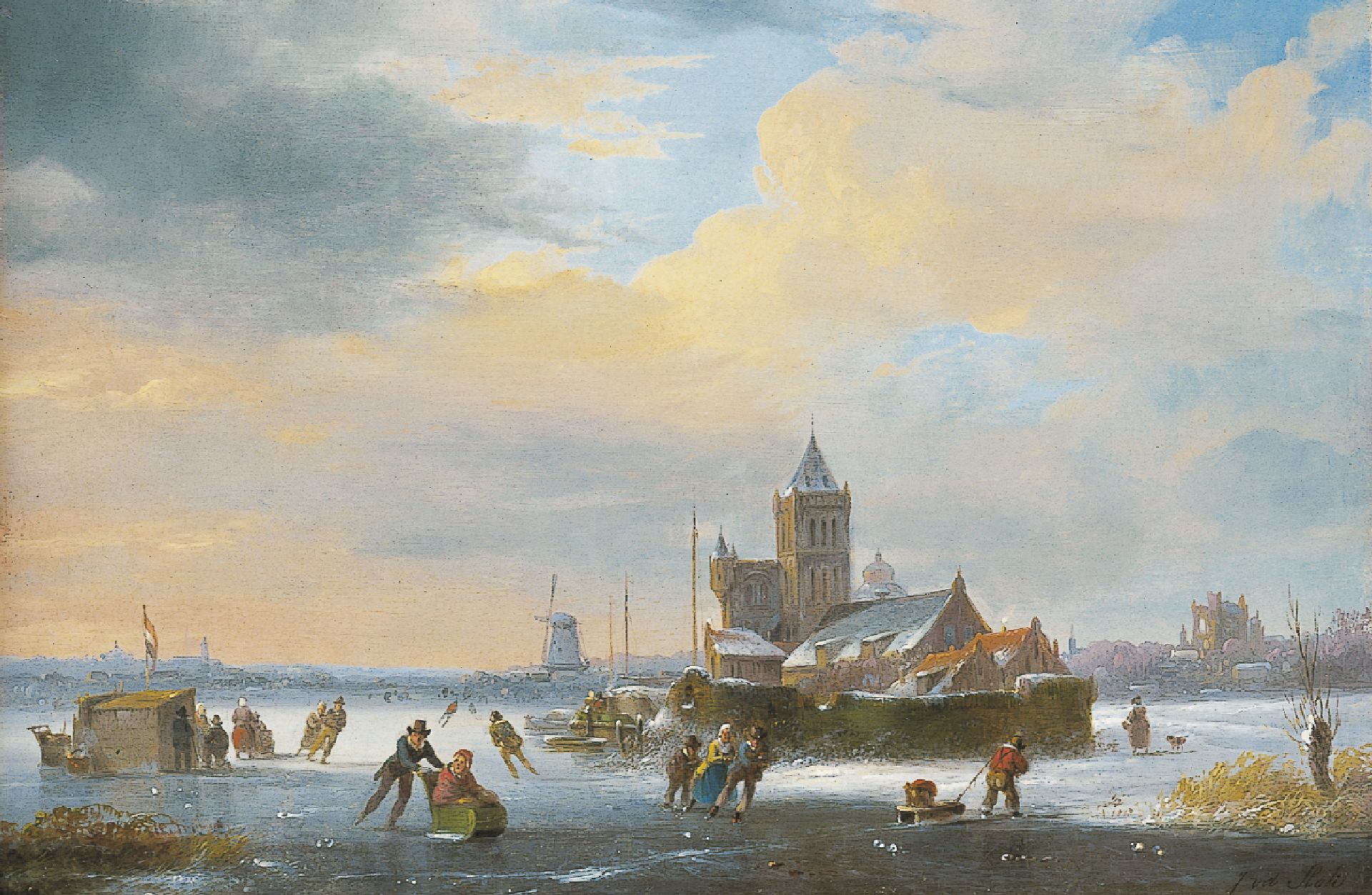 Jacobus van der Stok Kunstwerk • Gemälde • zuvor zu verkaufen A frozen river with skaters and a 'koek-en-zopie'