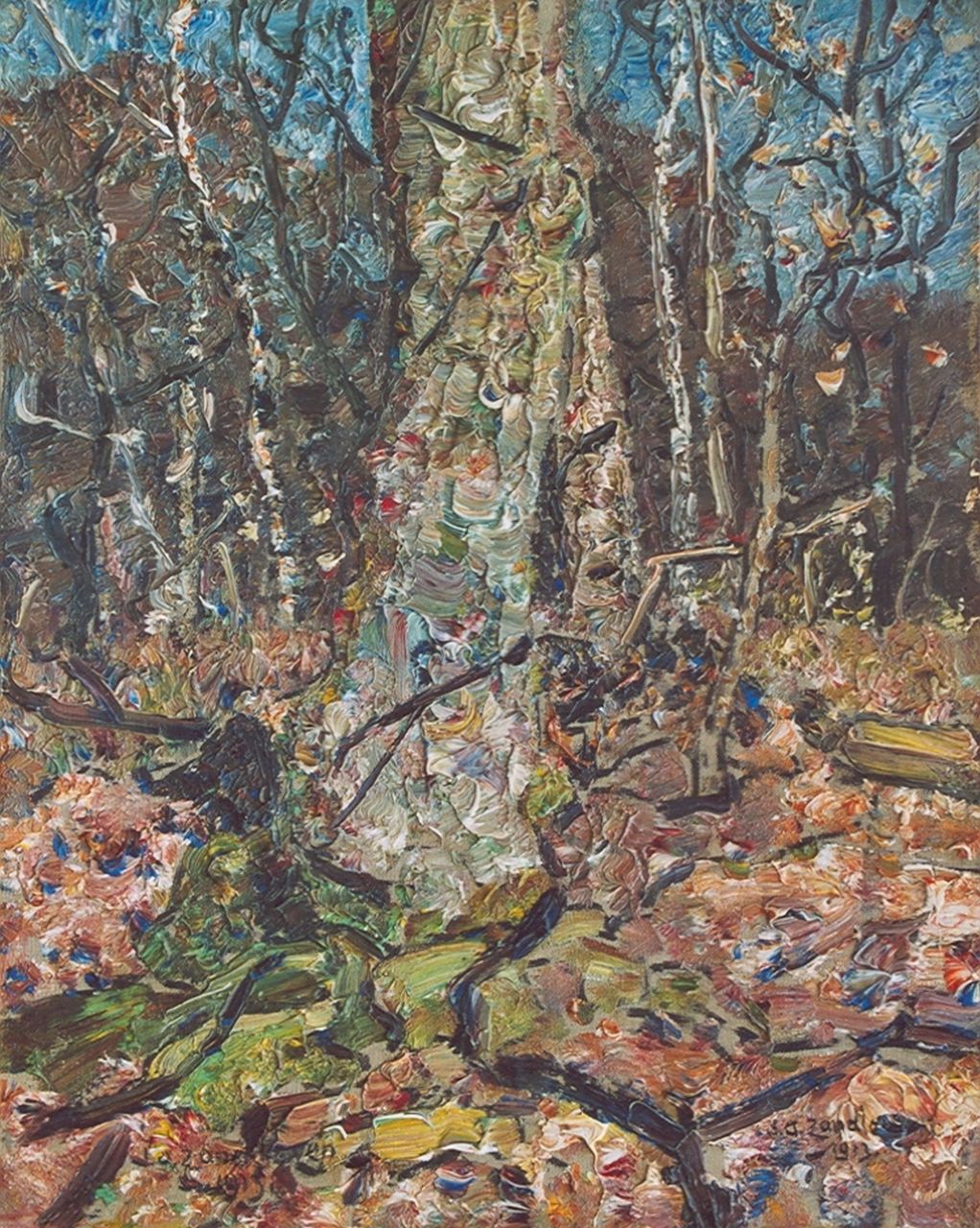 Im Jahre 1902, im Alter von 34 Jahren, wählte Jan Adam Zandleven für das Malerhandwerk auf Anraten - so lautet die Geschichte - der Maler Jozef Israels und P.J. Gabriels. Dann zog der Maler nach zwei Jahren nach Gorssel, wo er sich auf eigene Kraft weiterentwickelte. Die Bekanntschaft mit H.B.Bremmer, der sein Talent erkannte und der Hélène Kröller-Müller riet Werke von Zandleven zu kaufen, was sie denn auch tatsächlich gemacht hat. 1912 liess er sich in Putten auf der Veluwe nieder. Der Maler fühlte sich am meisten in seinem Element, wenn er sich mit seinem Esel in dem Wald zurückziehen konnte, weit vom Stadtgetümmel. Unter seinen Händen entstanden märchenhafte Gemälde von Birken und Buchen die sich im Schatten des Waldes auflichteten. Anfangs malte Zandleven Landschaften, nachher auch Dorfansichten, Stilleben und Innenräume; genau wie seine Bäume in einem breiten Pointilismus mit kleinen dicken Farbpunkten gemalt. Seine Gemälde zeigen die Spuren von längerer Aufmerksamkeit für den Gegenstand und einem unendlichen Weitermachen in der Farbe.