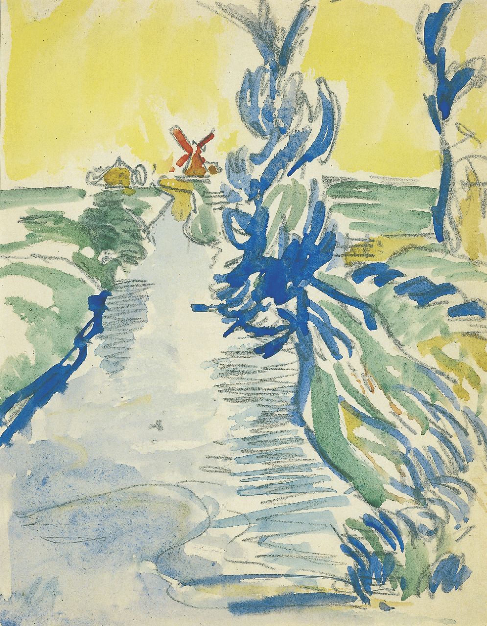 Jan Altink Kunstwerk • Aquarell • Zeichnung • zuvor zu verkaufen Dutch river landscape with red windmill