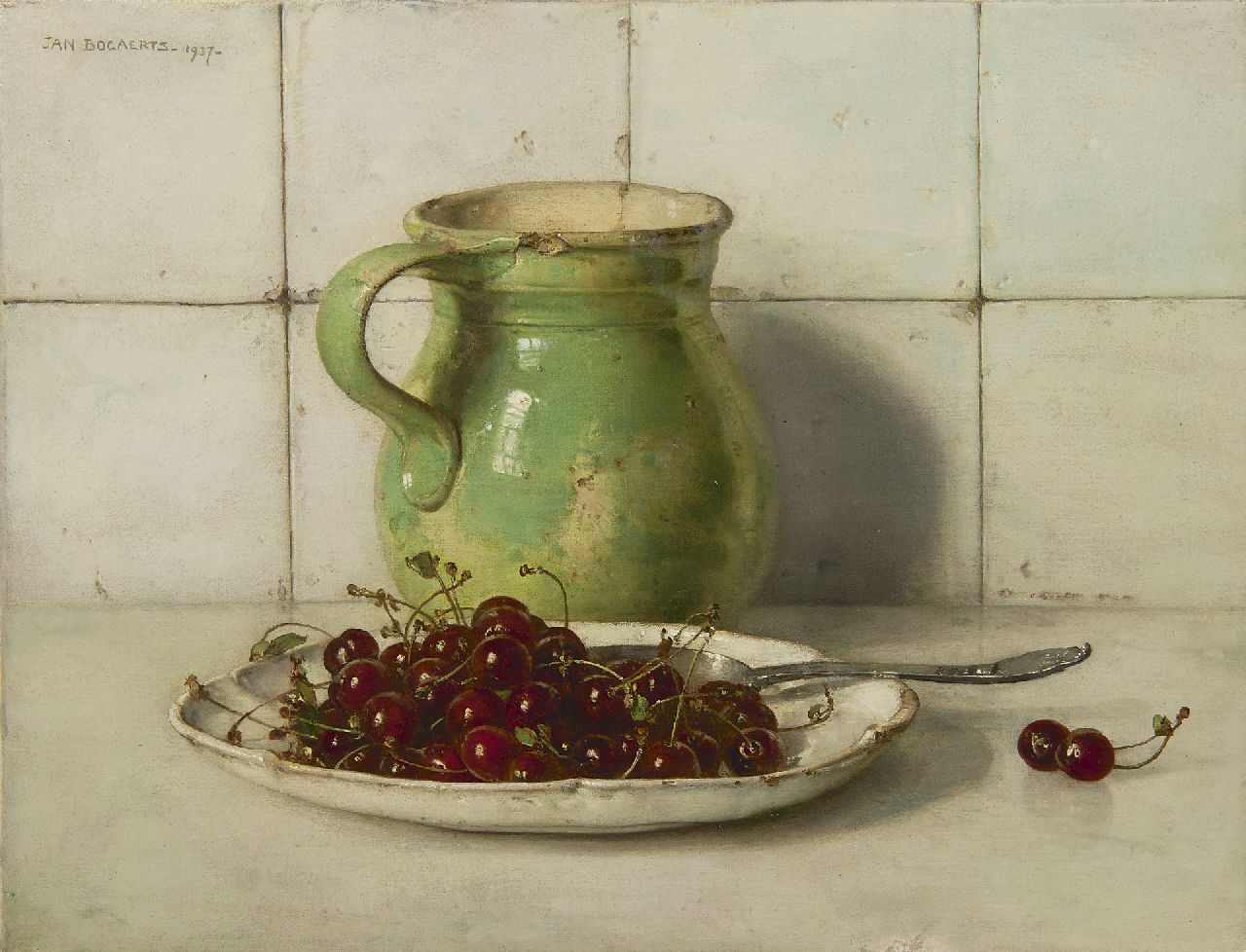 Jan Bogaerts Kunstwerk • Gemälde • zuvor zu verkaufen Still life with cherries and stoneware can