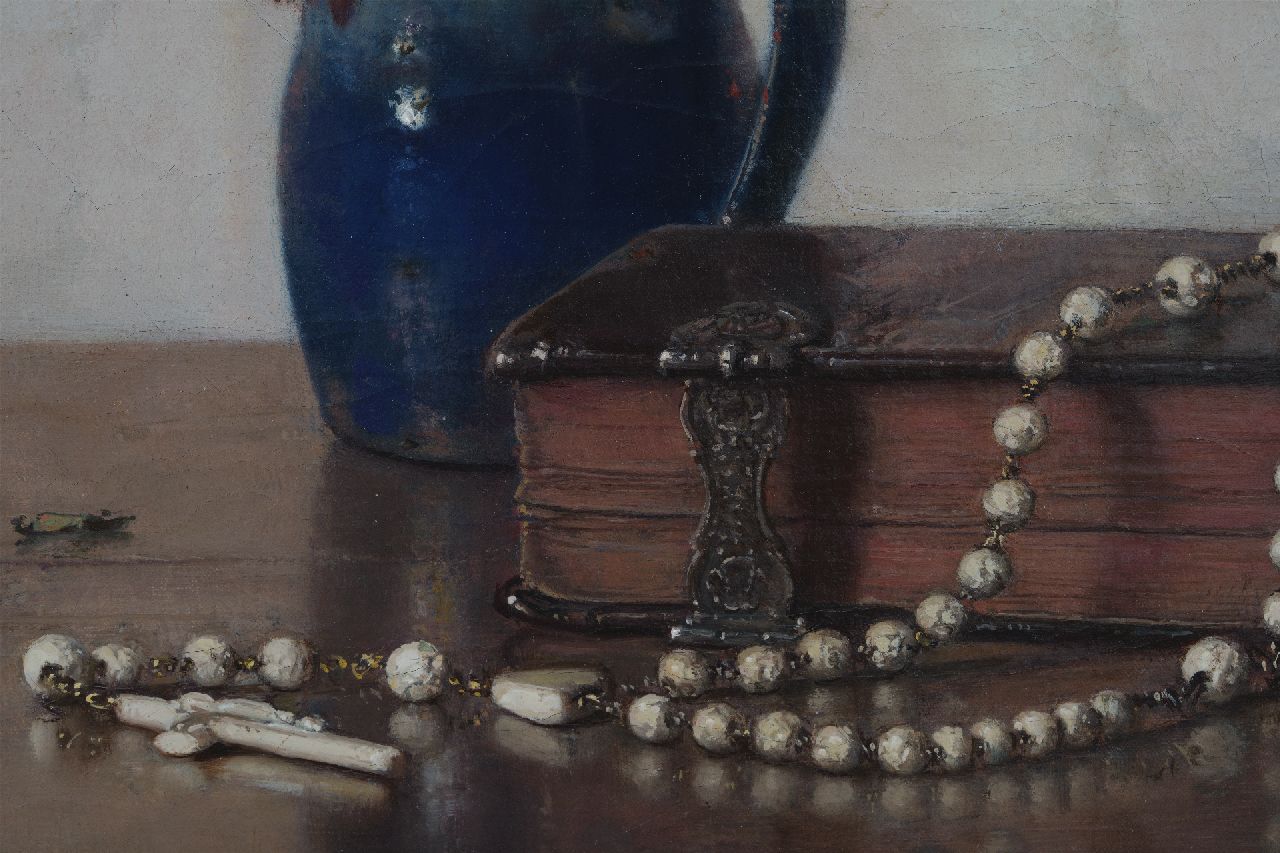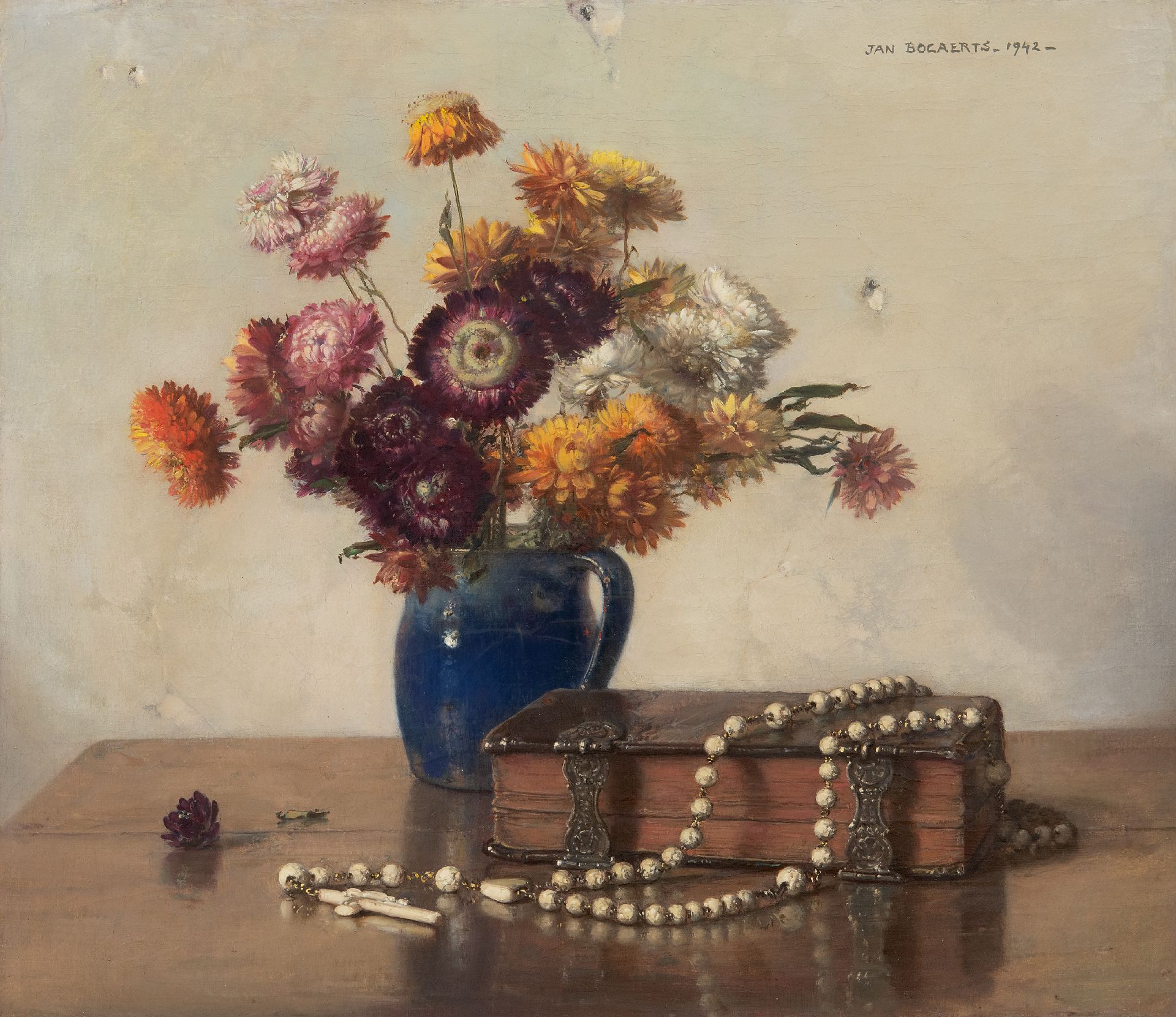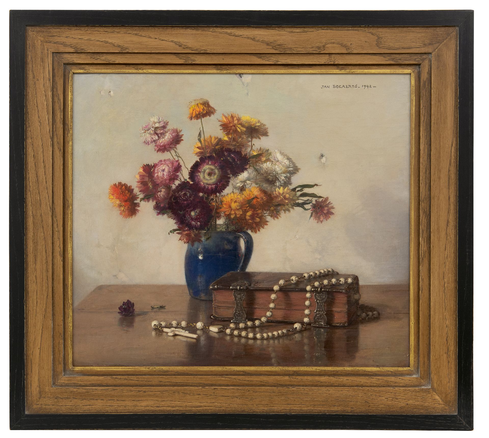 Jan Bogaerts Kunstwerk • Gemälde • zu verkaufen Stillleben mit Bibel und Vase mit Strohblumen