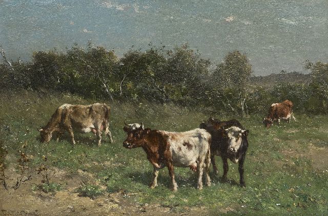 Jan de Haas | Grasende Kühe in einer Dünenlandschaft, Öl auf Papier auf Holz, 31,4 x 47,2 cm, Unterzeichnet l.u.