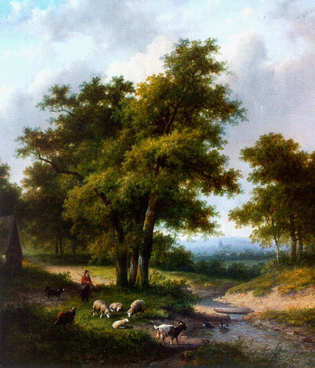 Jan Evert Morel II Kunstwerk • Gemälde • zuvor zu verkaufen A herdsman with cattle near a stream in a wooded landscape