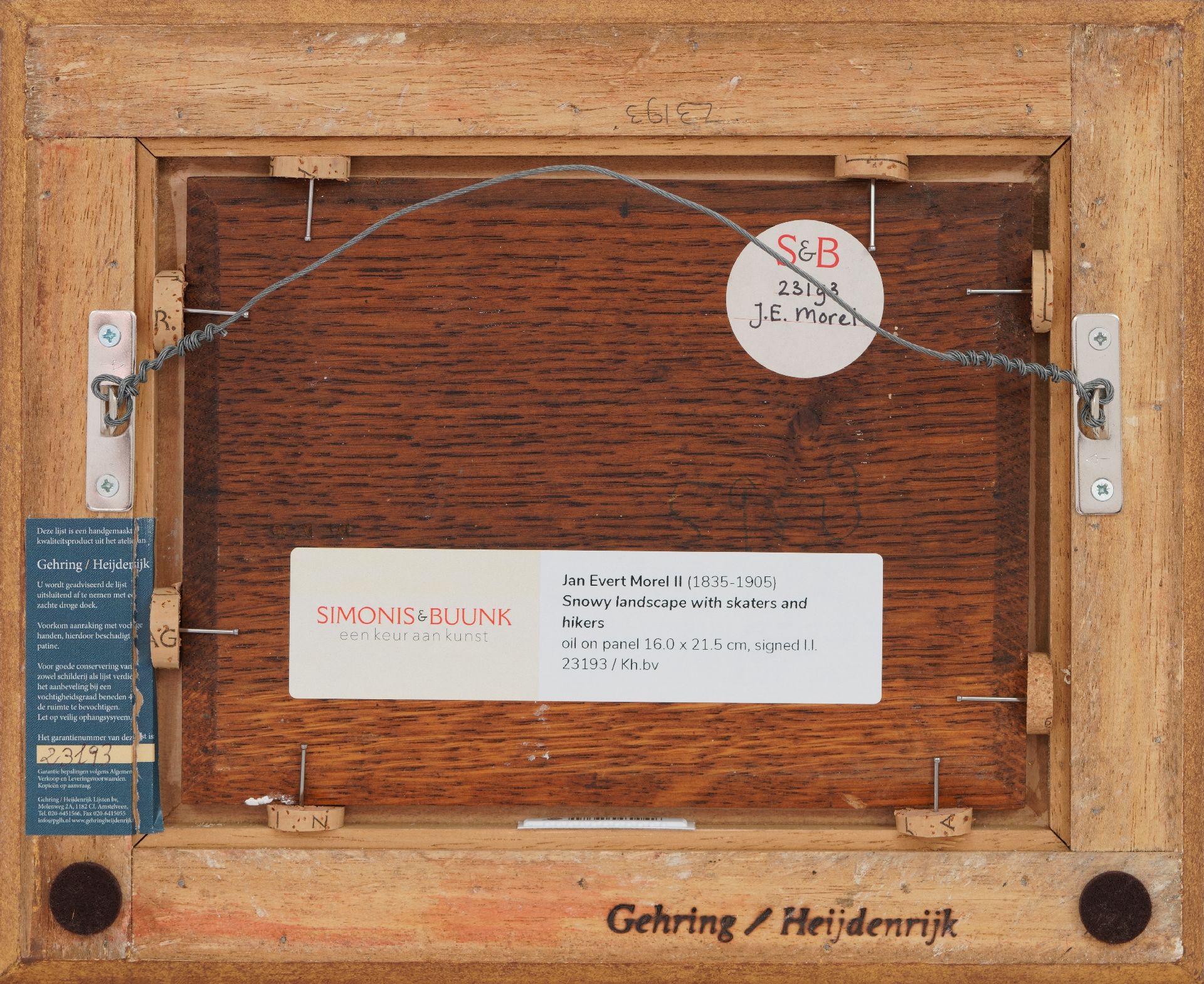 Jan Evert Morel II lebte und arbeitete hauptsächlich in Amsterdam. Er war der Sohn und wahrscheinlich ein Schüler von C.J. Morel, Maler von Seestücken und Porträts. Jan Evert Morel II konzentrierte sich hauptsächlich auf die Malerei romantischer Landschaften, die oft vom belgischen Maler Eugène Verboeckhoven dekoriert wurden. Für kurze Zeit arbeitete er auch im malerischen Oosterbeek, wo viele talentierte Künstler im Freien in der Tradition der französischen Barbizon-Maler arbeiteten. Seine idyllischen Landschaften sind oft klein und auf Tafel gemalt.