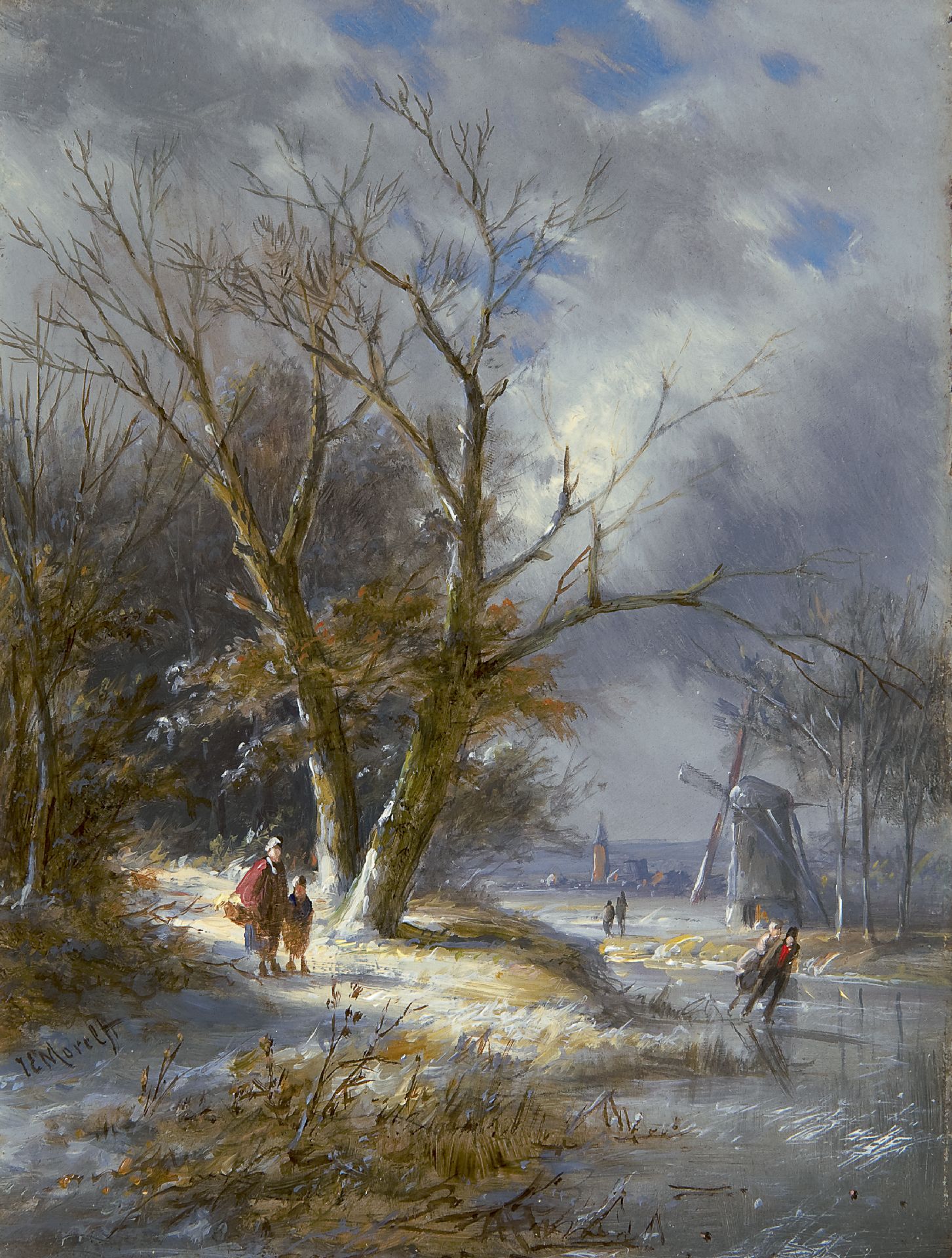 Jan Evert Morel II Kunstwerk • Gemälde • zuvor zu verkaufen Skaters and land folk in a winter landscape
