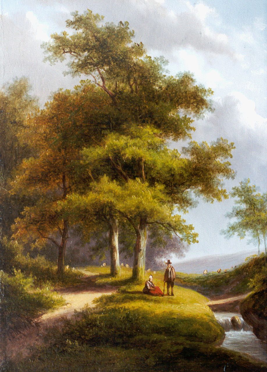 Morel II J.E.  | Jan Evert Morel II, Travellers near a stream, Öl auf Holz 20,4 x 15,1 cm, signed l.l.