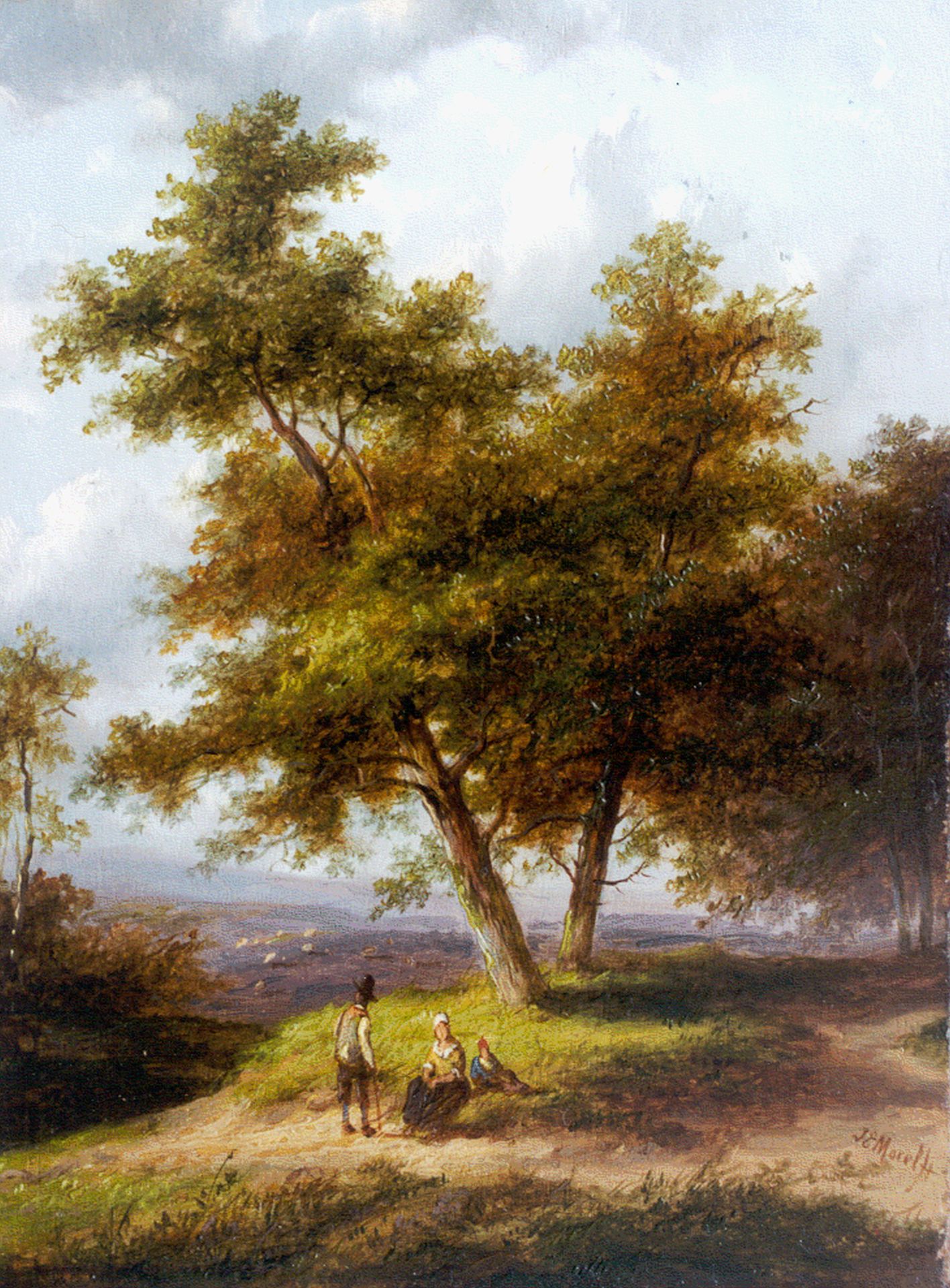 Jan Evert Morel II lebte und arbeitete hauptsächlich in Amsterdam. Er war der Sohn und wahrscheinlich ein Schüler von C.J. Morel, Maler von Seestücken und Porträts. Jan Evert Morel II konzentrierte sich hauptsächlich auf die Malerei romantischer Landschaften, die oft vom belgischen Maler Eugène Verboeckhoven dekoriert wurden. Für kurze Zeit arbeitete er auch im malerischen Oosterbeek, wo viele talentierte Künstler im Freien in der Tradition der französischen Barbizon-Maler arbeiteten. Seine idyllischen Landschaften sind oft klein und auf Tafel gemalt.