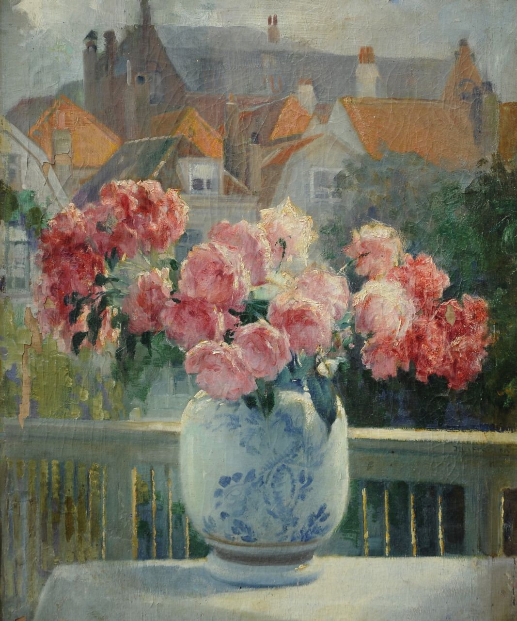 Jan Franken | Blumen in Vase auf Balkon mit Aussicht über die Stadt, Öl auf Leinwand, 61,7 x 50,2 cm, Unterzeichnet u.r. auf der Balustrade
